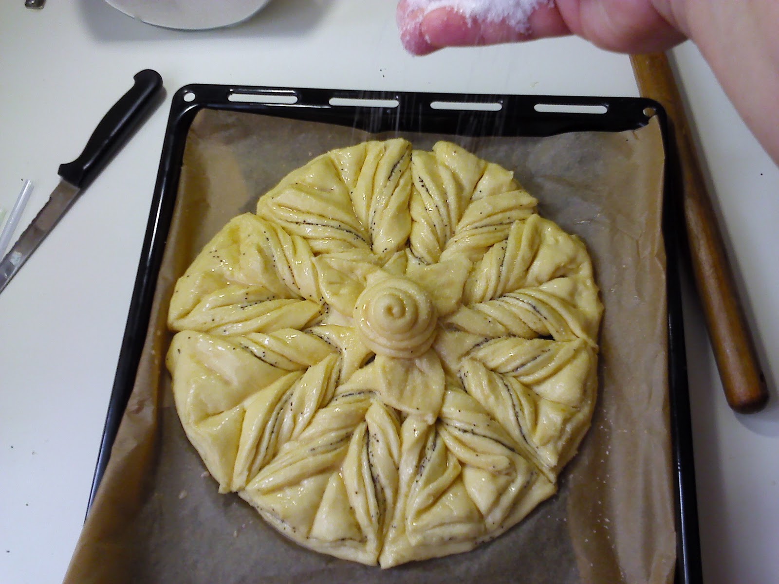 Не забывайте про контур, потому как из теста посыпанного и смазанного потом ничего путнего сделать не получиться, а выкидывать жалко