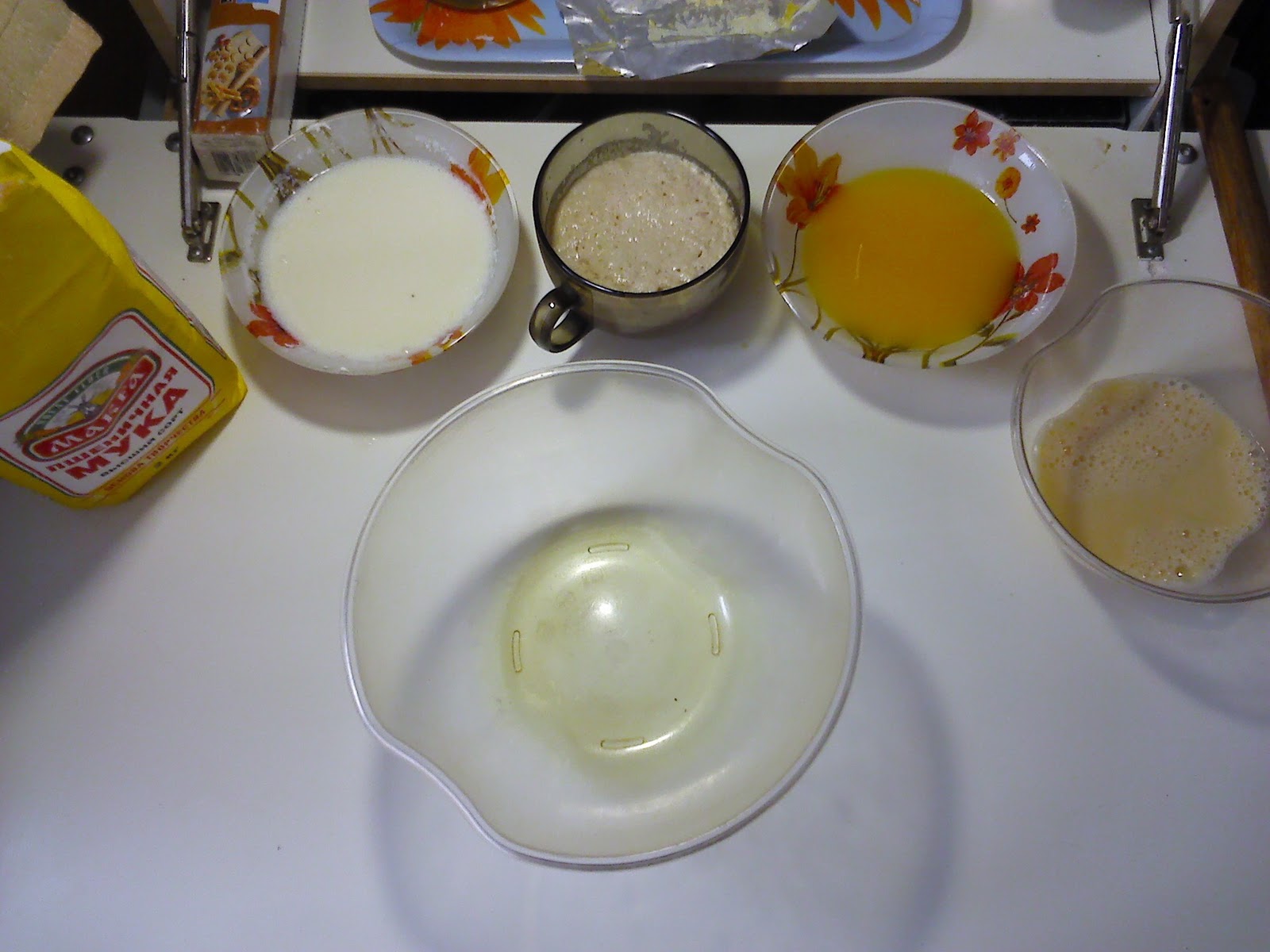 Всыпаем муку в тару для замеса, делаем углубление и последовательно выливаем туда все подготовленные ингредиенты (жиры в последнюю очередь)
