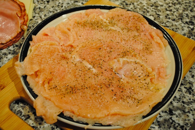 Куриные грудки кладем между двумя слоями пластиковой пленки и хорошо отбиваем молотком для мяса так, чтобы получились тонкие пластины.