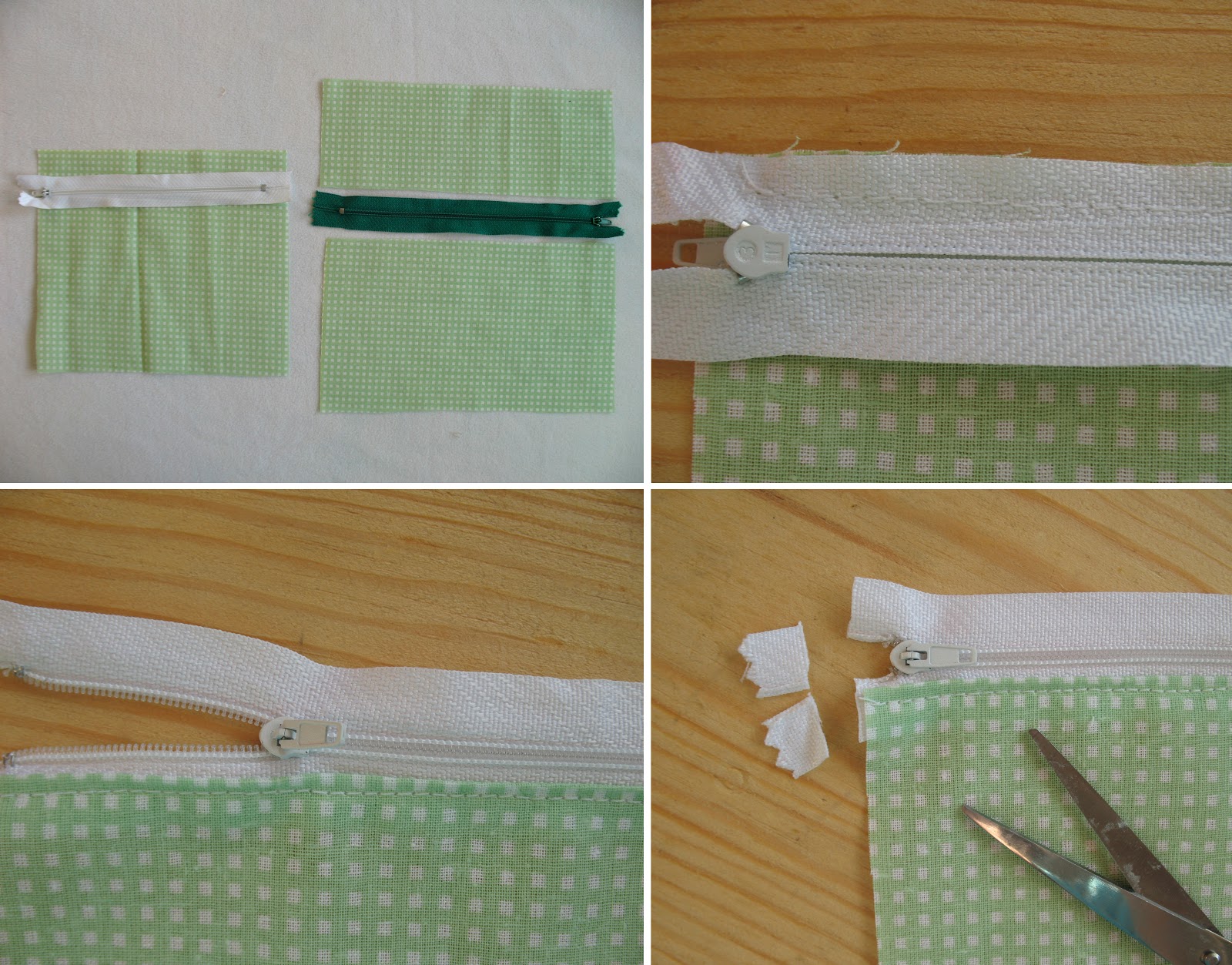 Проклейте нитяную намётку и приклейте к краю новой молнии кусочек ткани , как показано на фото (нажмите на фотографию, чтобы увеличить). Отрежьте.