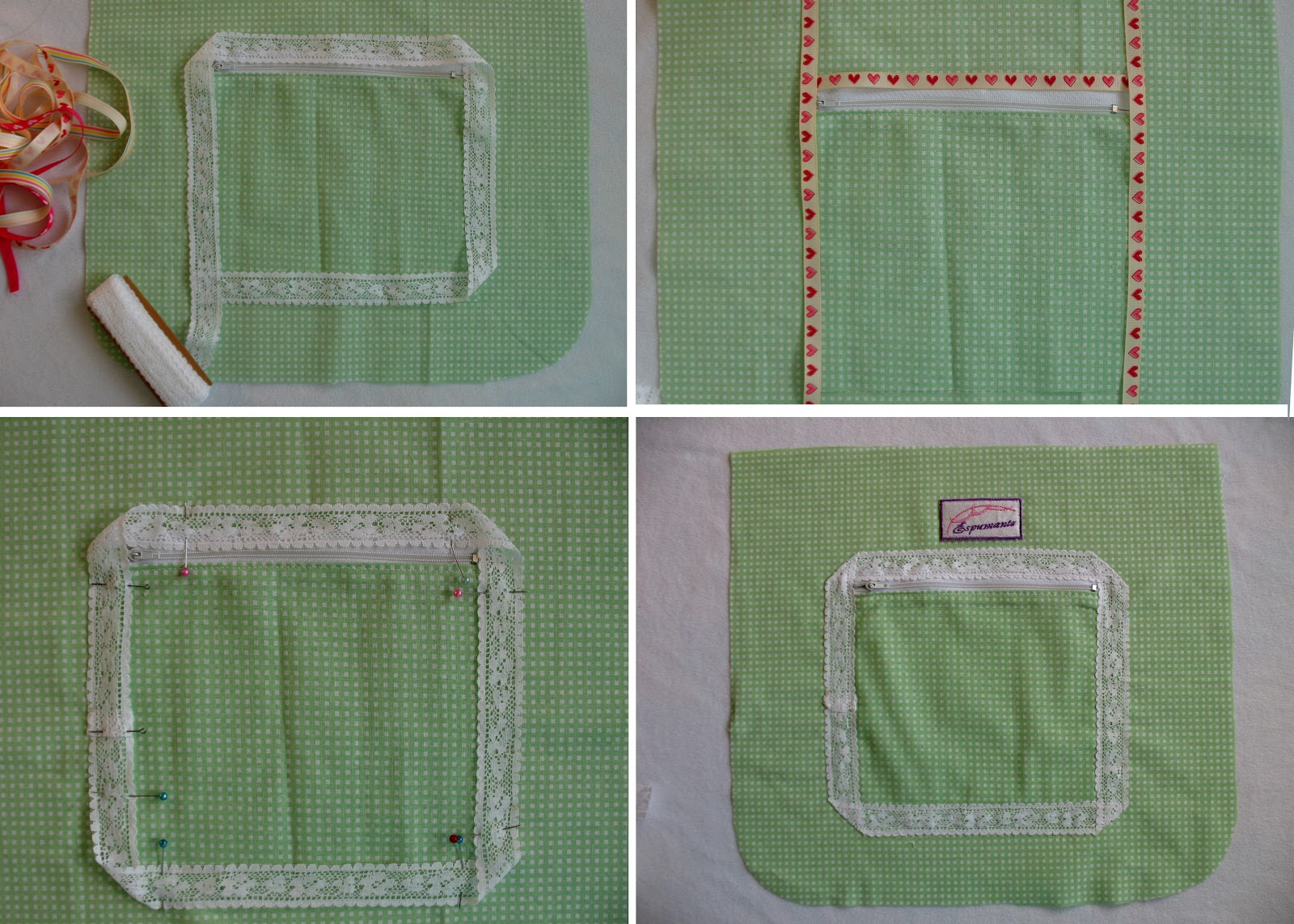7. Размещаем карман в нужном месте, я решила совместить верхний край у кармана с верхним краем подкладки. Прикалываем иголочками.