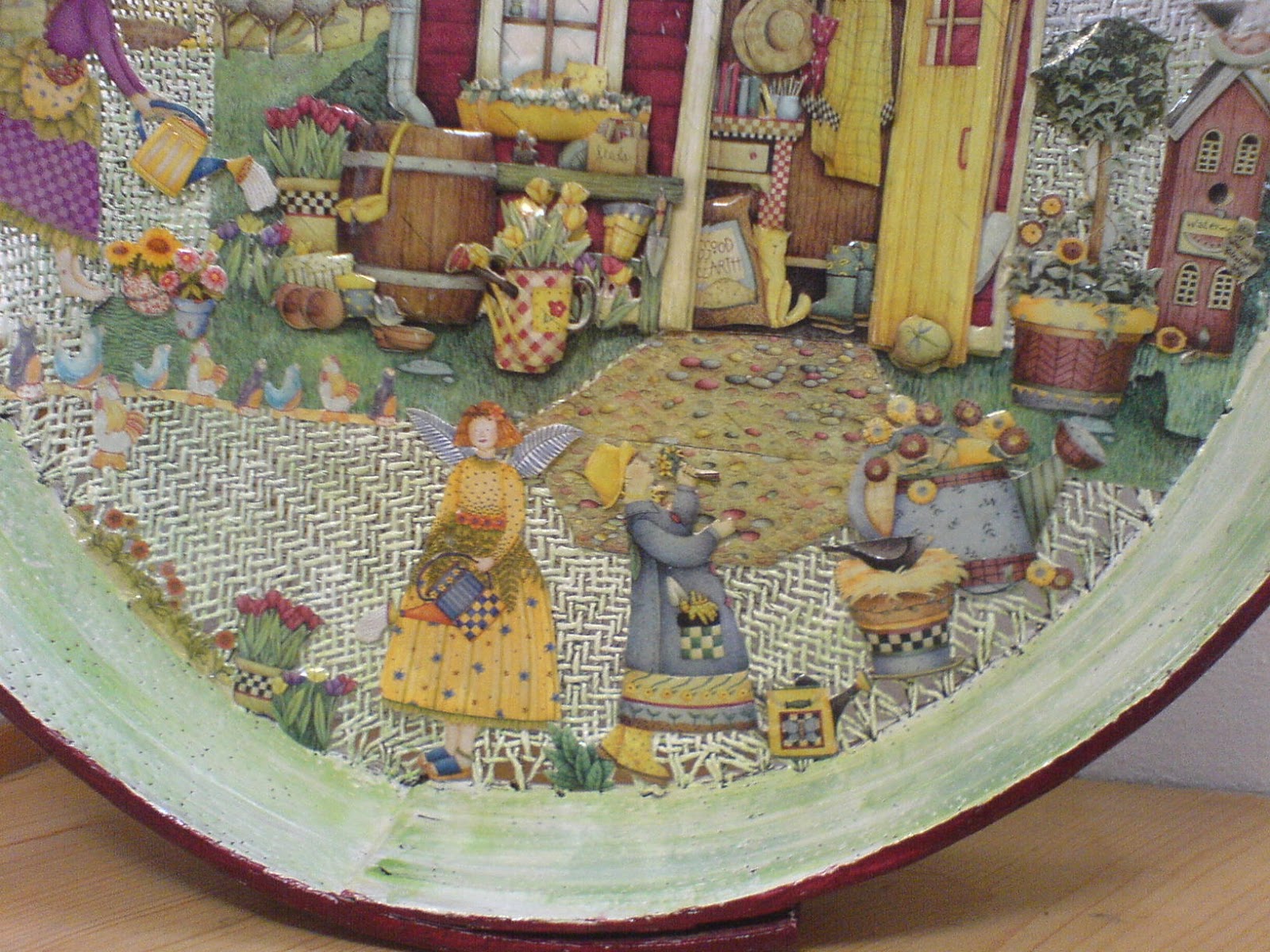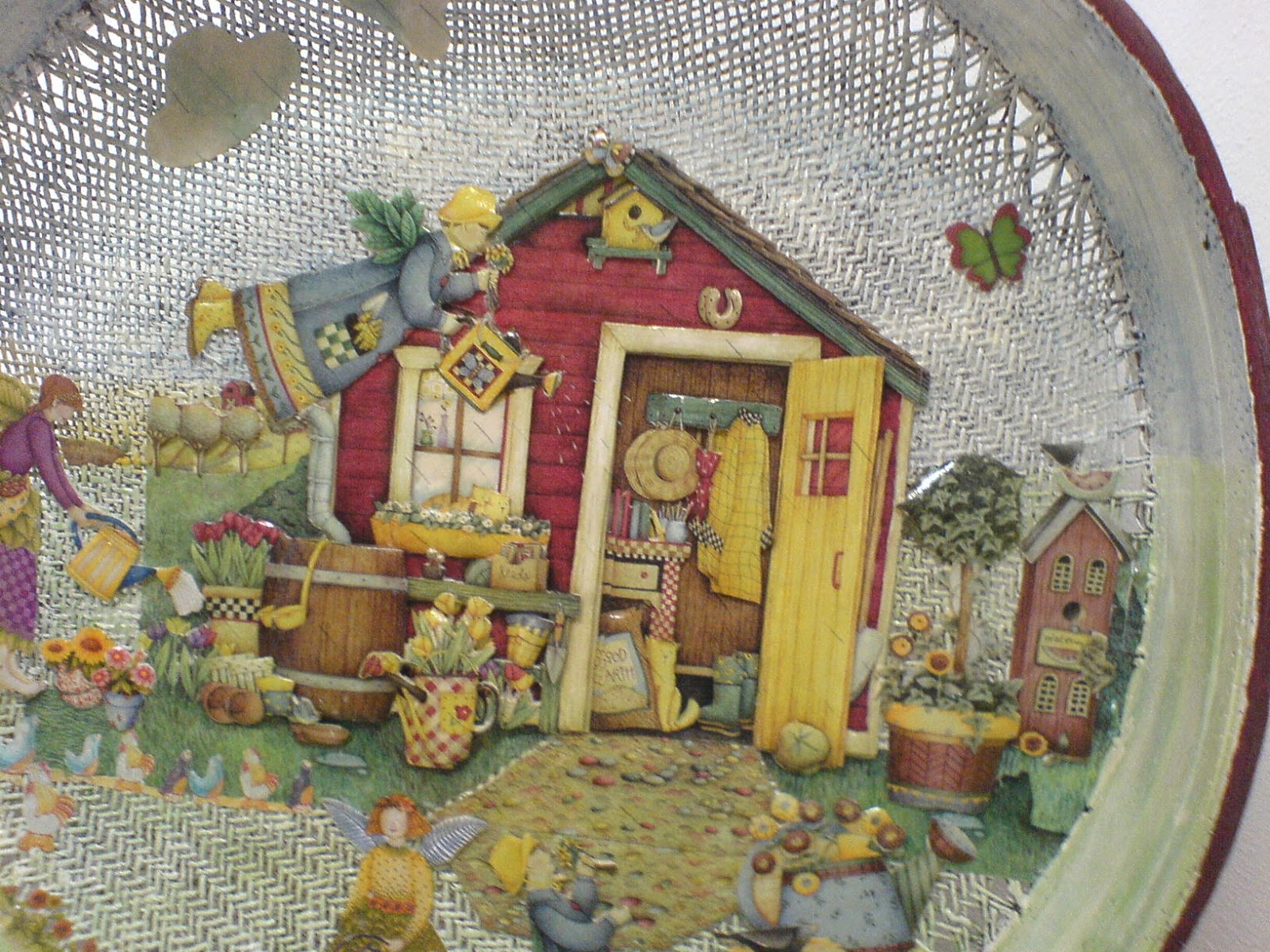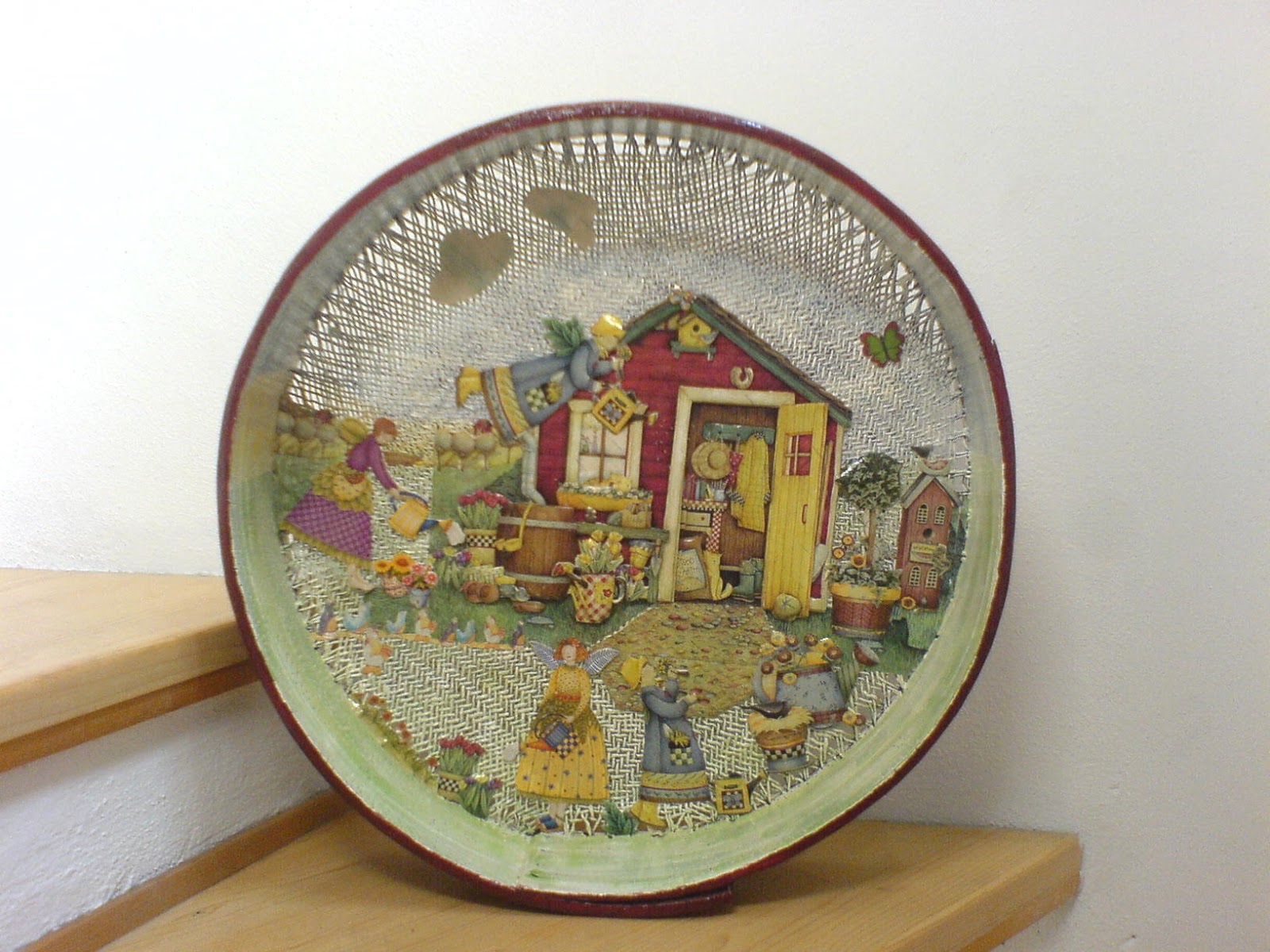 Описания нет,но все понятно! Клеится салфетка,вернее декупажная карта,прямо на сетку.Затем подрисовка фона и окраска самого сита!