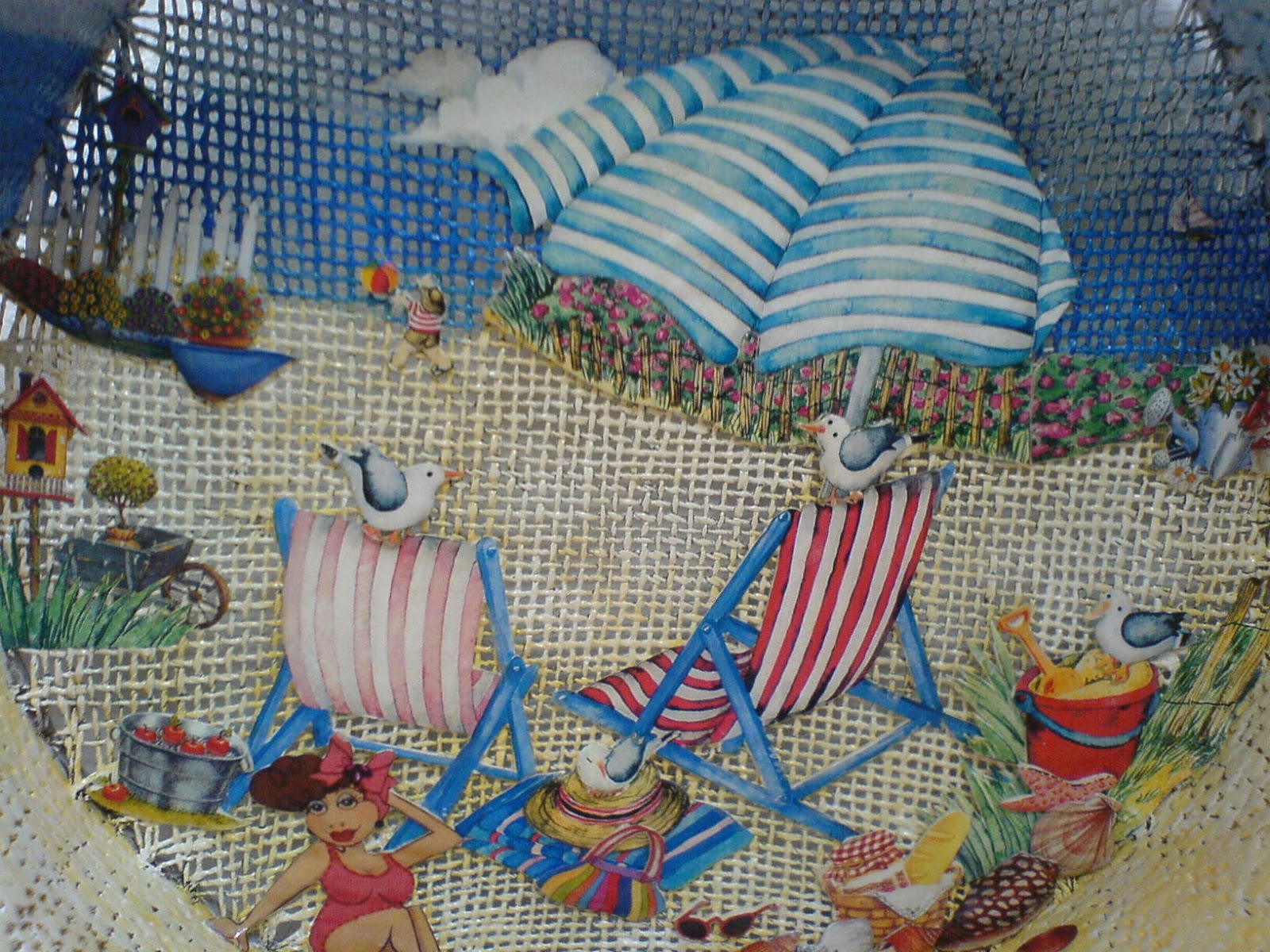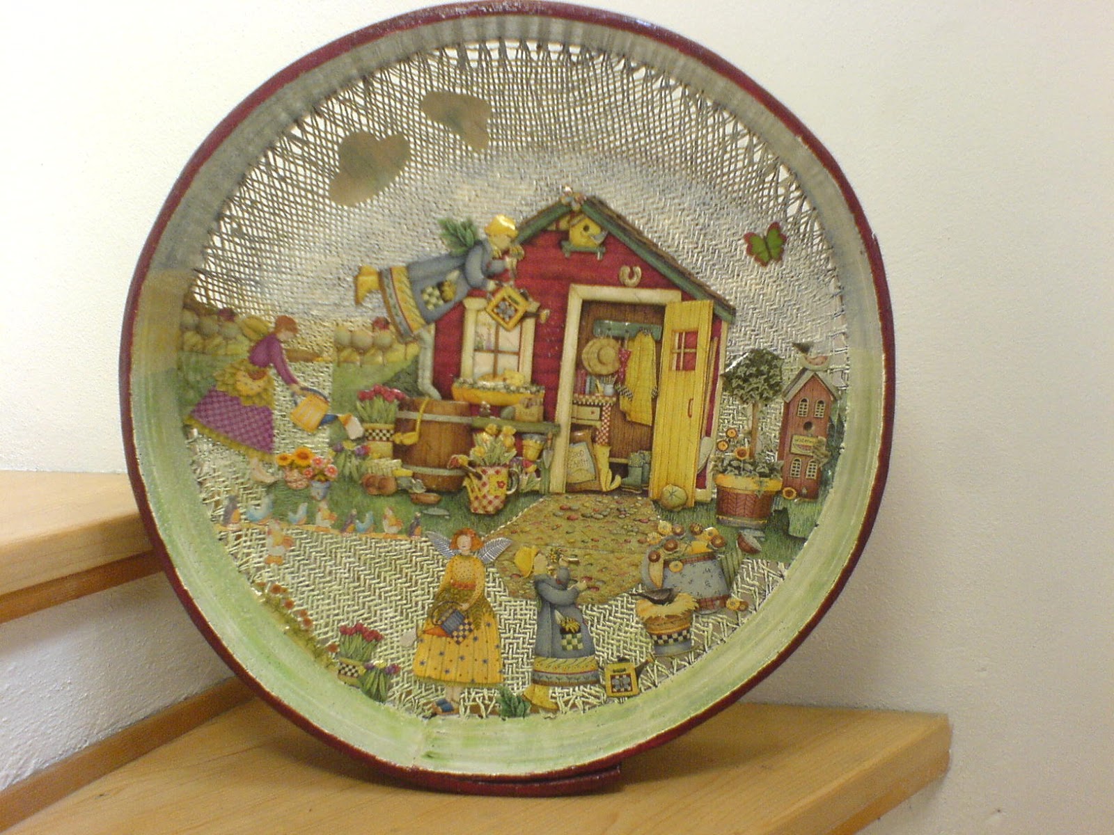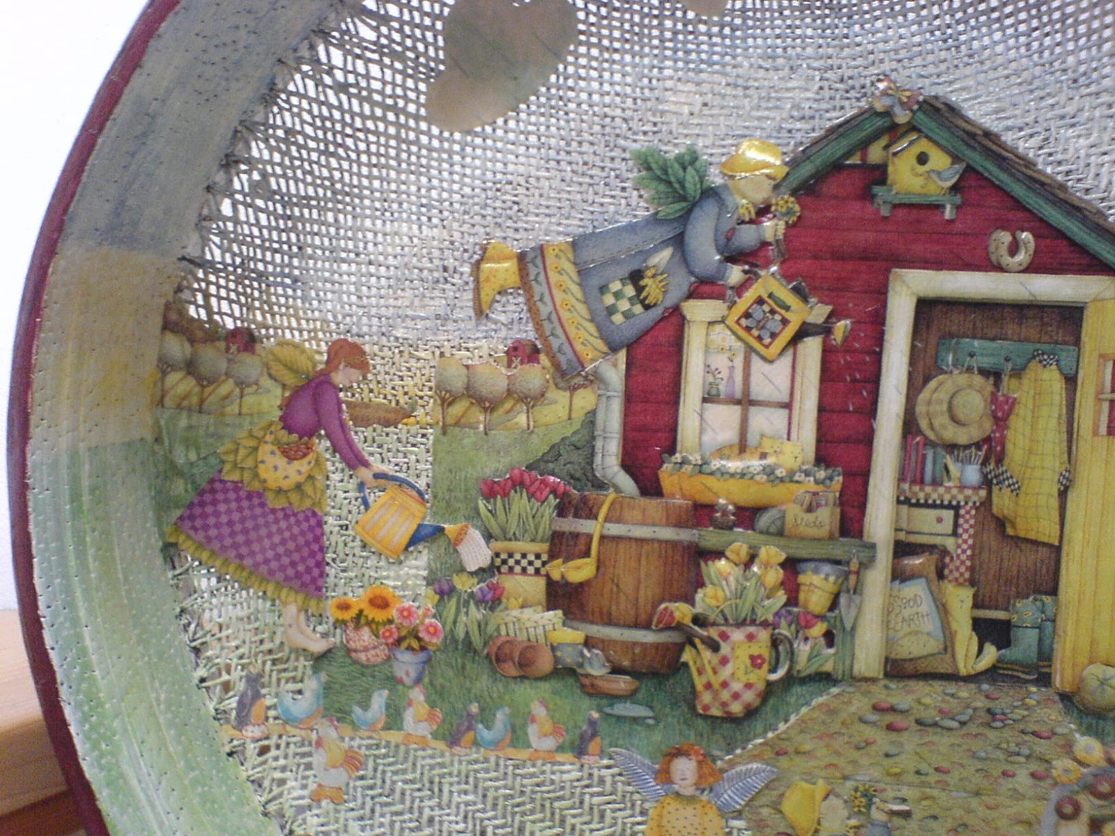 Описания нет,но все понятно! Клеится салфетка,вернее декупажная карта,прямо на сетку.Затем подрисовка фона и окраска самого сита!