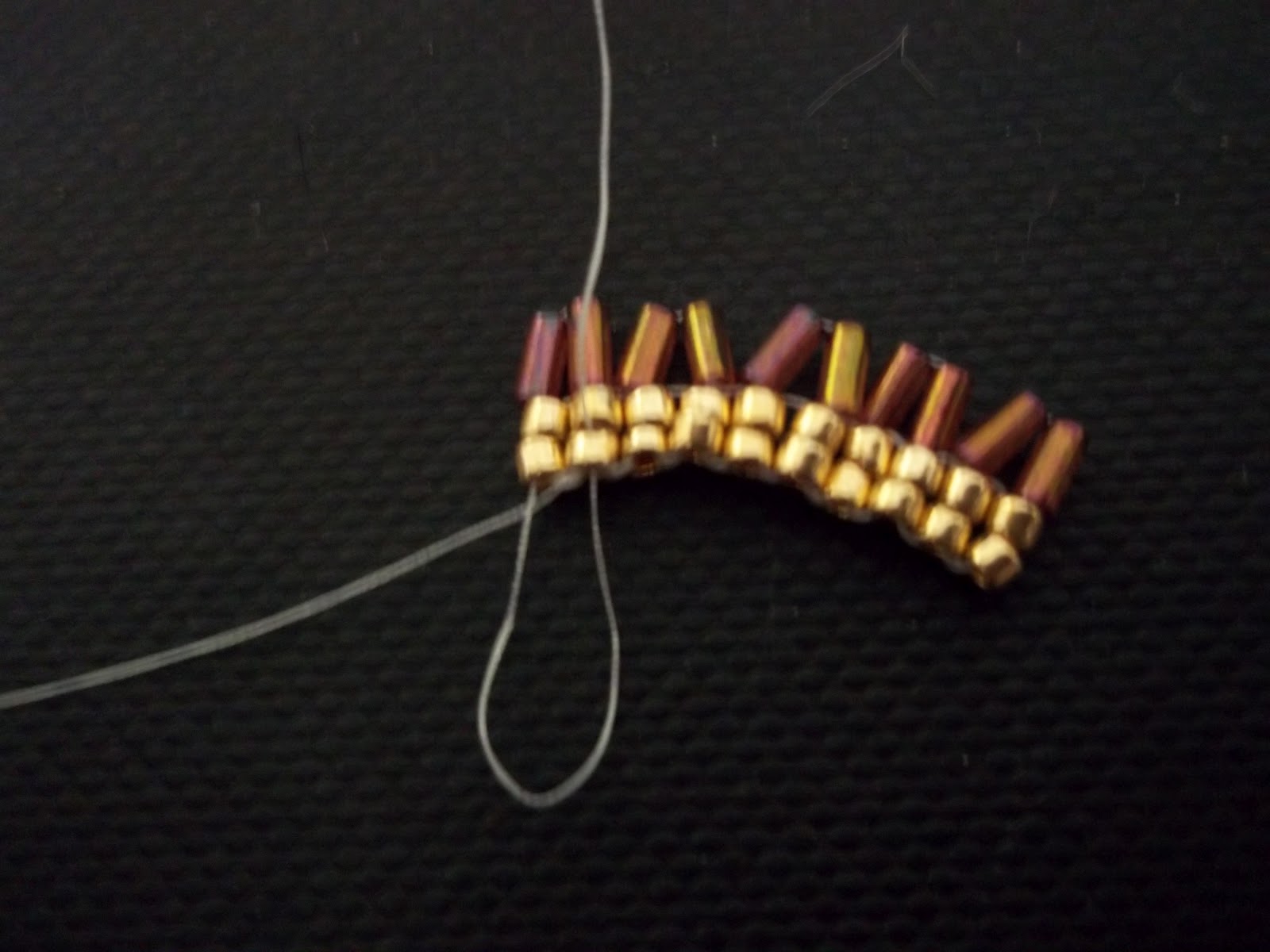 [320x240]Теперь мы собираемся сделать 'поворот' снова. Это проще, в этот раз, поскольку " елочка " дает вам небольшой разрыв между стеклярус, что легко помещаются своей иглой насквозь. Положите иглу через разрыв между первыми двумя стеклярус в первом ряду стекляруса, как показано - затем вытяните нить через.