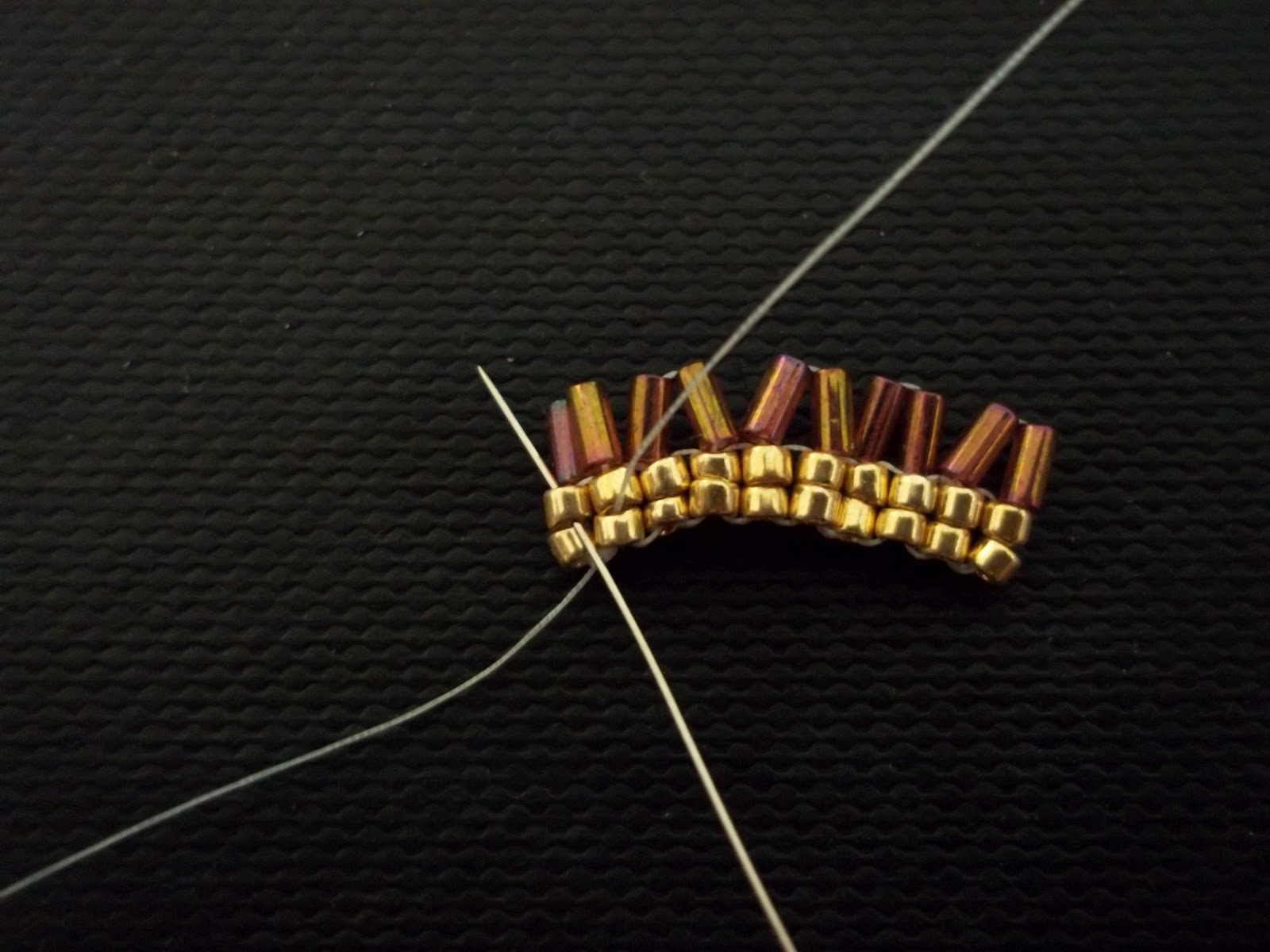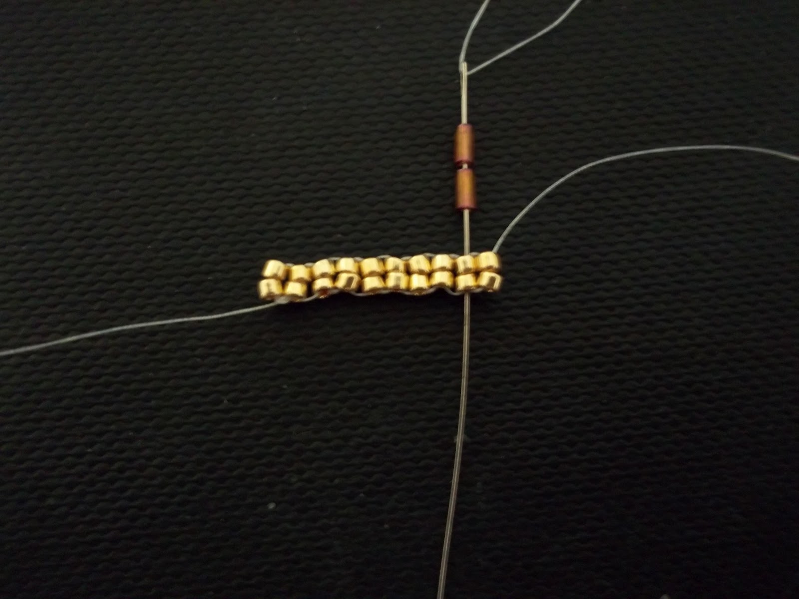 Этот ряд еще елочка, но с небольшим дополнением. Подобрать две стеклярусом и швом вниз через Горна, рядом с одним ваш поток на выходе, как показано на рисунке. НЕ пройти рядом с горном в линию, хотя.