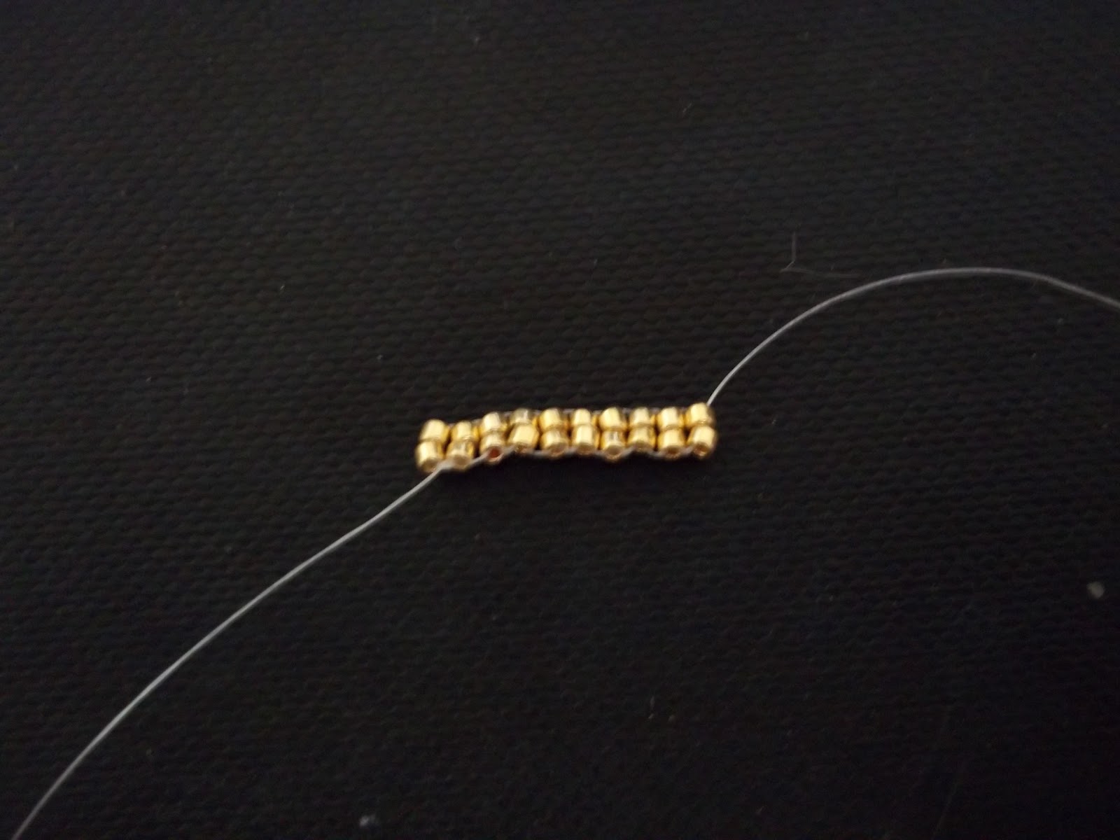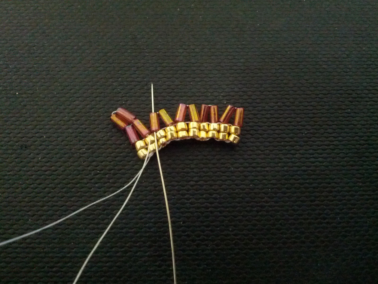 Мы собираемся сделать то же самое в этом ряду, как в последнем ряду, за исключением того, мы добавляем две семена между каждым стежком, а не только один. Подобрать две стеклярус, пройти через Горна, рядом с одним ваш поток на выходе, забрать два семена, идите по следующей Горна, и повторите.