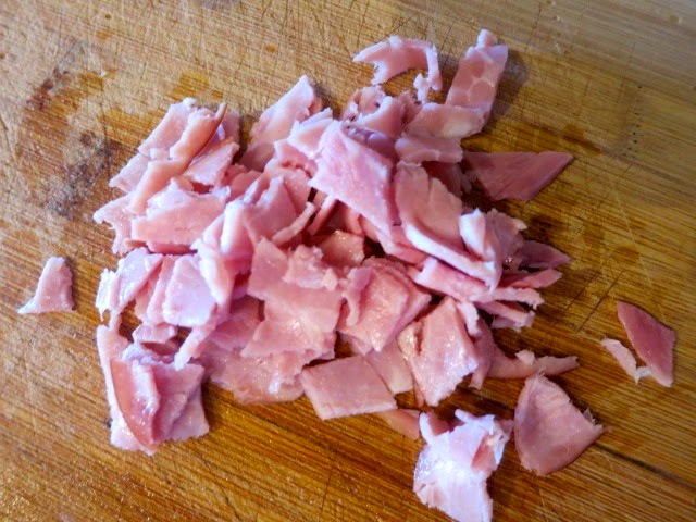 Ветчину режем небольшими кусочками. (Часто ломтик ветчины кладут на блин целиком; делайте, как вам удобнее.)