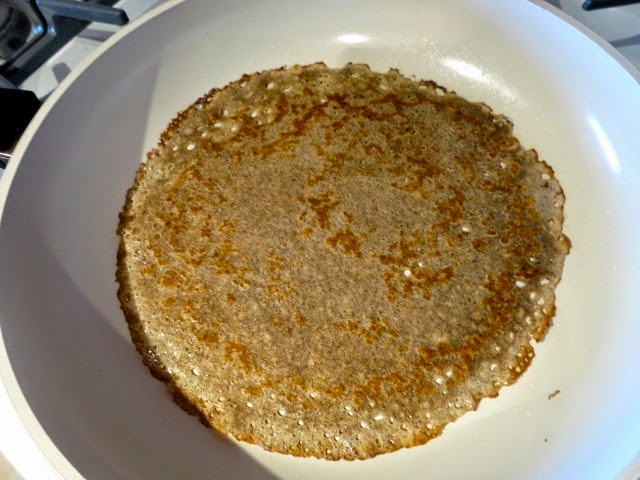 Классический способ приготовления таких блинов - на сковороде. Итак, разогреваем на среднем огне сковороду. Кладем на нее блин красивой стороной вниз.