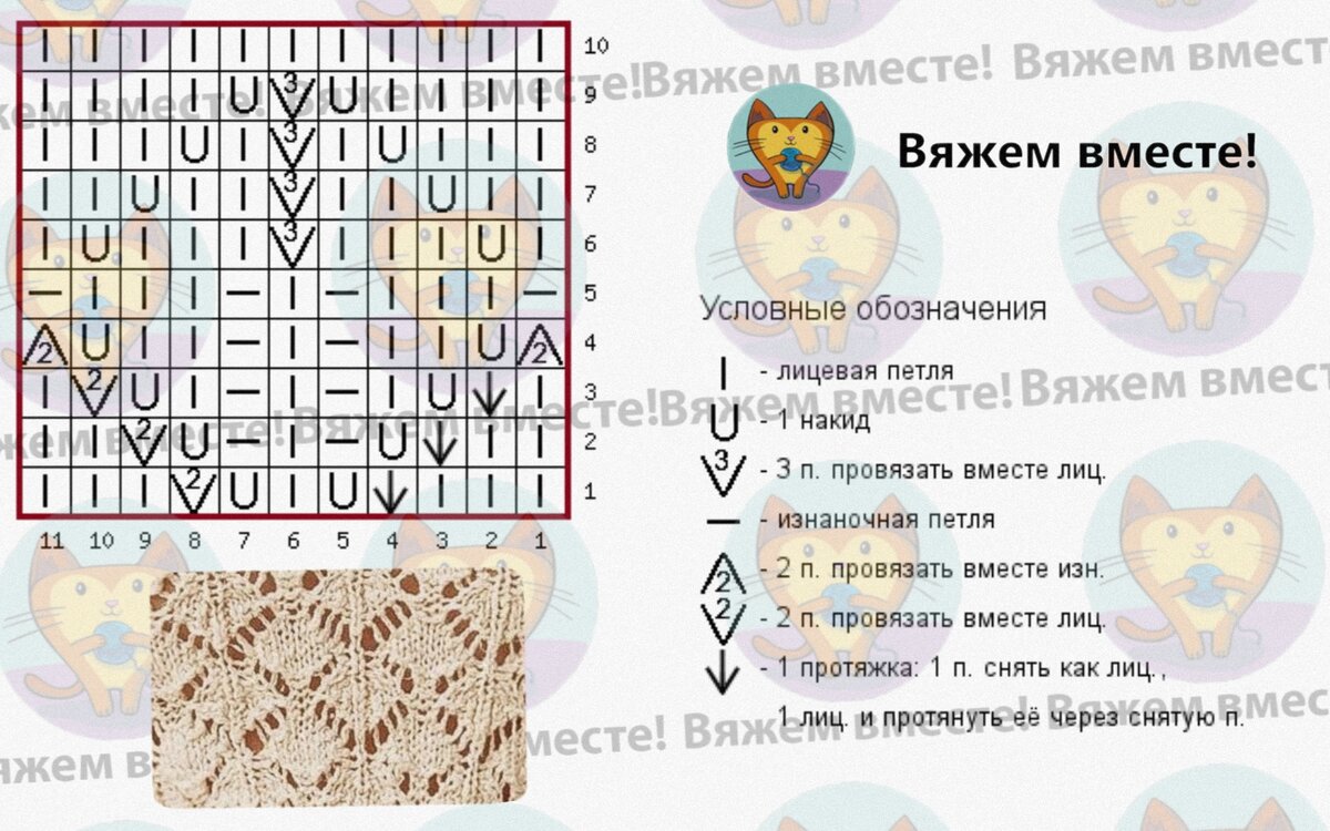 Раппорт равен 11 петлям по ширине и 10 рядам по высоте. Узор формируется в каждом ряду вязания, поэтому на схеме даны как нечётные, так и чётные ряды для вязания круговыми рядами.