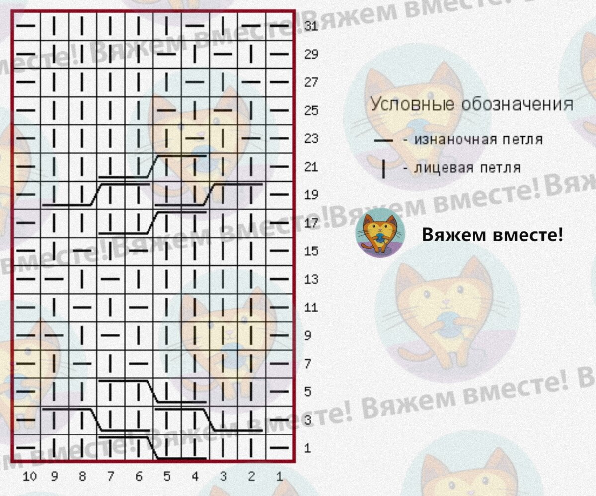 Узор представляет собой вертикальные жгуты с элементами жемчужного узора. Раппорт равен 10 петлям по ширине и 32 рядам по высоте, выделен красной рамкой на схеме. Высоту раппорта можно менять на своё усмотрение, схема составлена приблизительно.