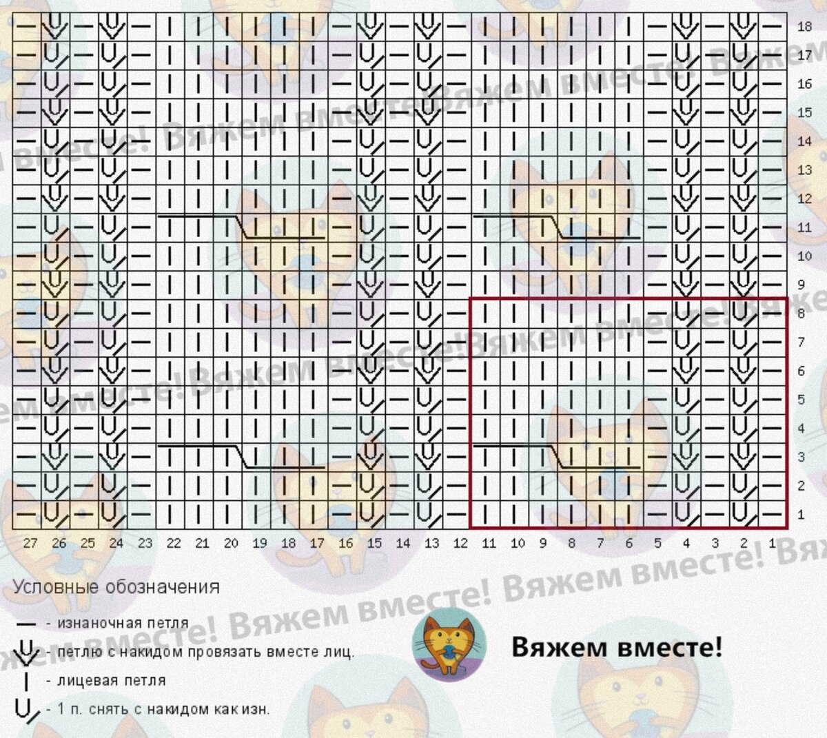 Раппорт узора равен 11 петлям по ширине и 8 рядам по высоте. На схеме обозначены не только лицевые, но и изнаночные ряды вязания, петли чётных рядов обозначены так, как они лежат на лицевой стороне полотна.