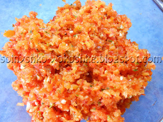 В блендере измельчить чеснок с болгарским перцем и жгучим, если вы будете его использовать. Как на аджику, не слишком мелко.