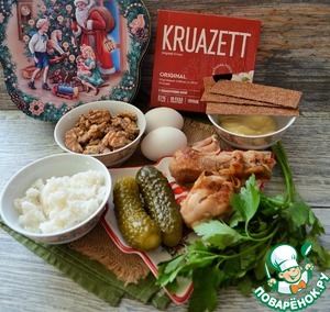 Приготовить продукты. Рис и яйца сварить заранее. Орехи обжарить.