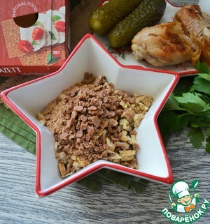 Куриную голень освободить от кости и кожи, нарвать на волокна. Выложить следующим слоем, покрошить орехи и смазать соусом.