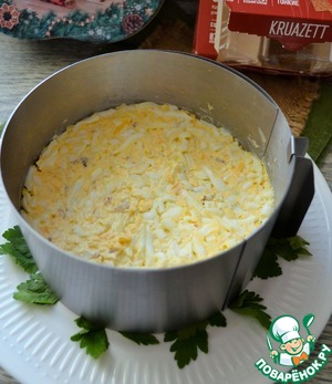 Собирать этот салат лучше слоями в кольце, 14-16 см..
