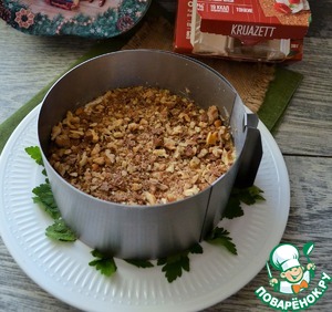 Сверху разложить оставшуюся смесь орехов и хлебцев. Слегка утрамбовать, оставить в холодильнике на 2-4 часа.