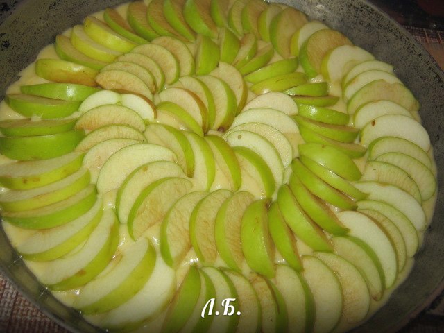 60% теста вылить на смазанную растительным маслом сковородку и выложить на него нарезанные тонкими ломтиками яблоки, которые нужно посыпать сахаром. Оставшееся тесто нанести на яблоки тонким слоем и хорошенько разровнять.