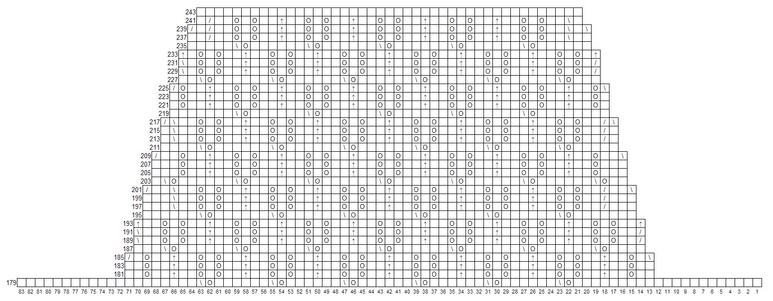 After 63 rows (repeating lace pattern 4 times) you have got one sleeve. To start back add 12 st at both sides. Than you should have 83 st. To make a back work without icreasing and decreasing for next 115 rows. Than ( in 229 row) decrease 12 st at both sides and start making secound sleeve, similar to first one. Knock one st of at both sides in 185, 193, 201, 209, 217, 225, 233 and 239 row. Than finish after 243 rows (look at picture number 3).