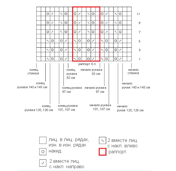 Вяжите прямыми рядами до высоты изделия 51 (51, 51, 51, 51, 51, 51,5, 51,5) см от вершины планки, закончить нечётным рядом схемы. Начните вязать поворотными рядами с изнаночного ряда, вяжите по рисунку, пока длина рукава не станет 54,5 (54,5, 55, 55, 56, 56, 56,5, 56,5) см от сгиба планки рукава. Закрыть все петли.
