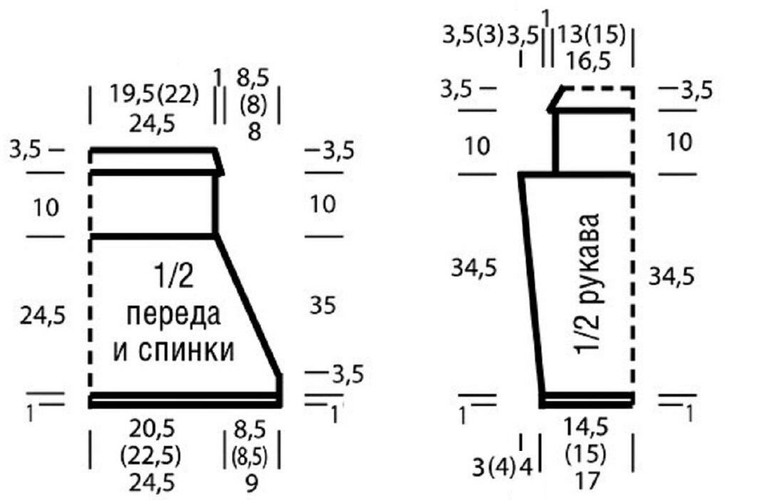 Одновременно для скоса рукава прибавить с обеих сторон в каждом 14-м ряду от планки 5 раз по 1 п. и в каждом 12-м ряду 3 раза по 1 п. (в каждом 12-м ряду 4 раза по 1 п. и в каждом 10-м ряду 6 раз по 1 п.) в каждом 12-м ряду 4 раза по 1 п. и в каждом 10-м ряду 6 раз по 1 п. = 88 (96) 104 п.