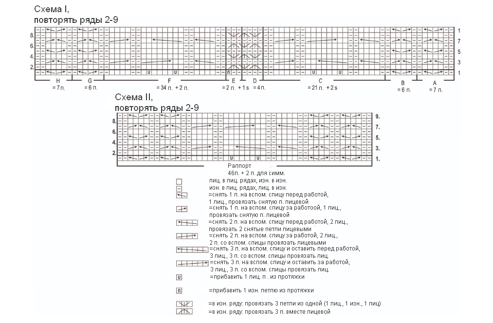 Перейдите на спицы большего размера и продолжайте вязание согласно Схеме II ряд 1 в соответствии с таблицей: 3 лиц. (2 изн., 3 лиц.) 2 лиц. (1 изн., 3 лиц.) 2 лиц., *3 изн., 3 лиц., повторите от * ещё 1(1)2(2)3 раз, вяжите по схеме узора (46 п. + 2 п.), * 3 лиц., 3 изн., повторите от * ещё 1(1)2(2)3 раз, 3 лиц. (3 лиц., 2 изн.) 2 лиц. (3 лиц., 1 изн.) 2 лиц.