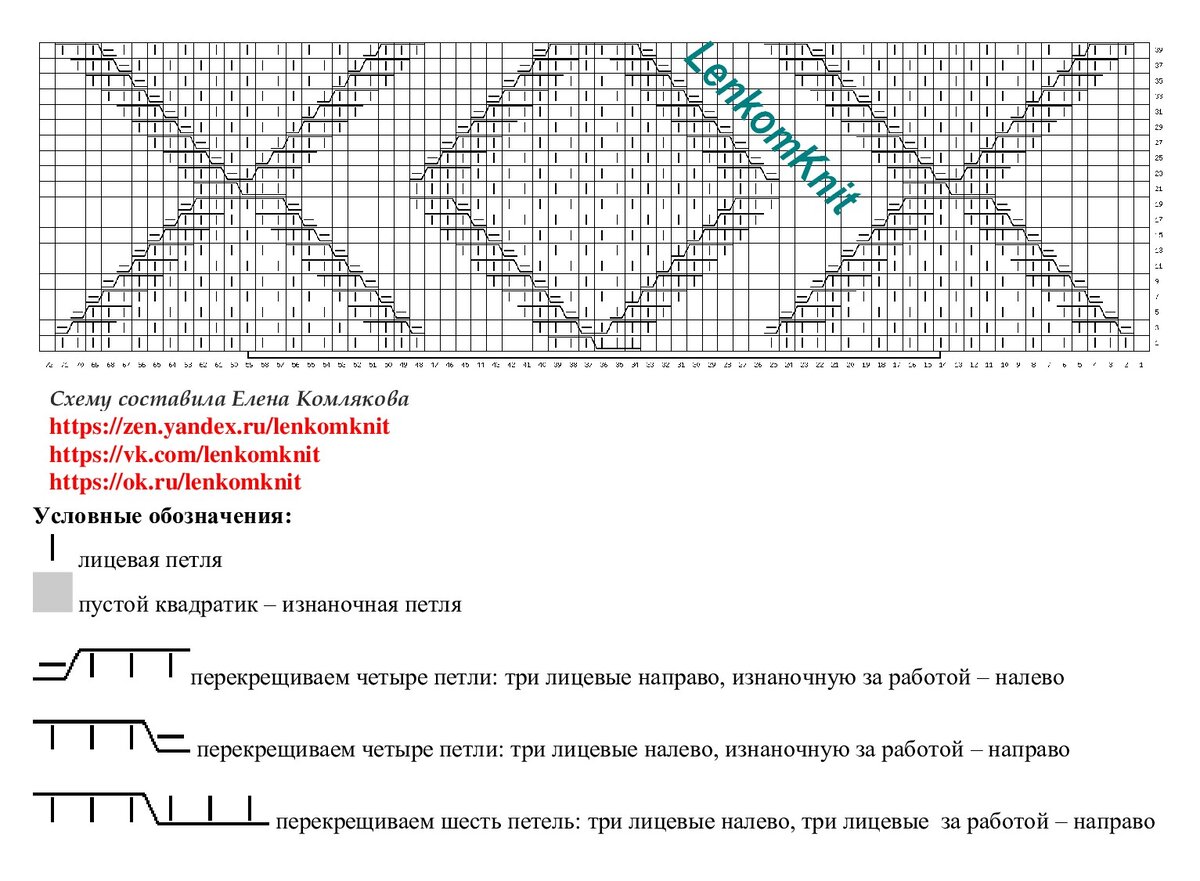 На рисунке - схема вязания рельефных ромбов. В высоту нарисован один раппорт узора (40 рядов), а в ширину раппорт отмечен в нижней части схемы.