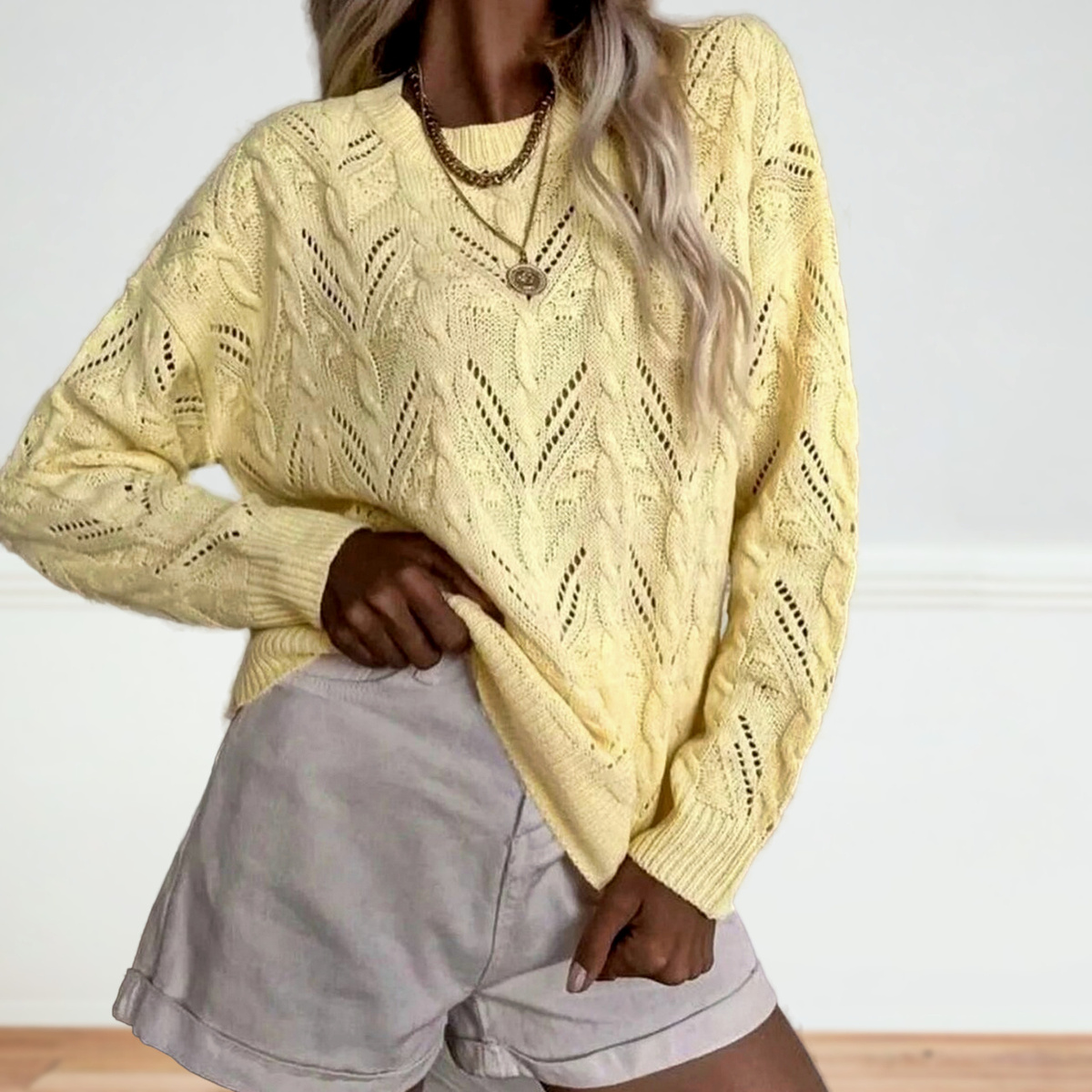 Нежный светло-лимонный джемпер оверсайз от китайского бренда Shein. Очень эффектно смотрится на девушке-мулатке. Можно взять на заметку, если любите интенсивный загар — бледные лимонные оттенки его выигрышно подчеркнут.