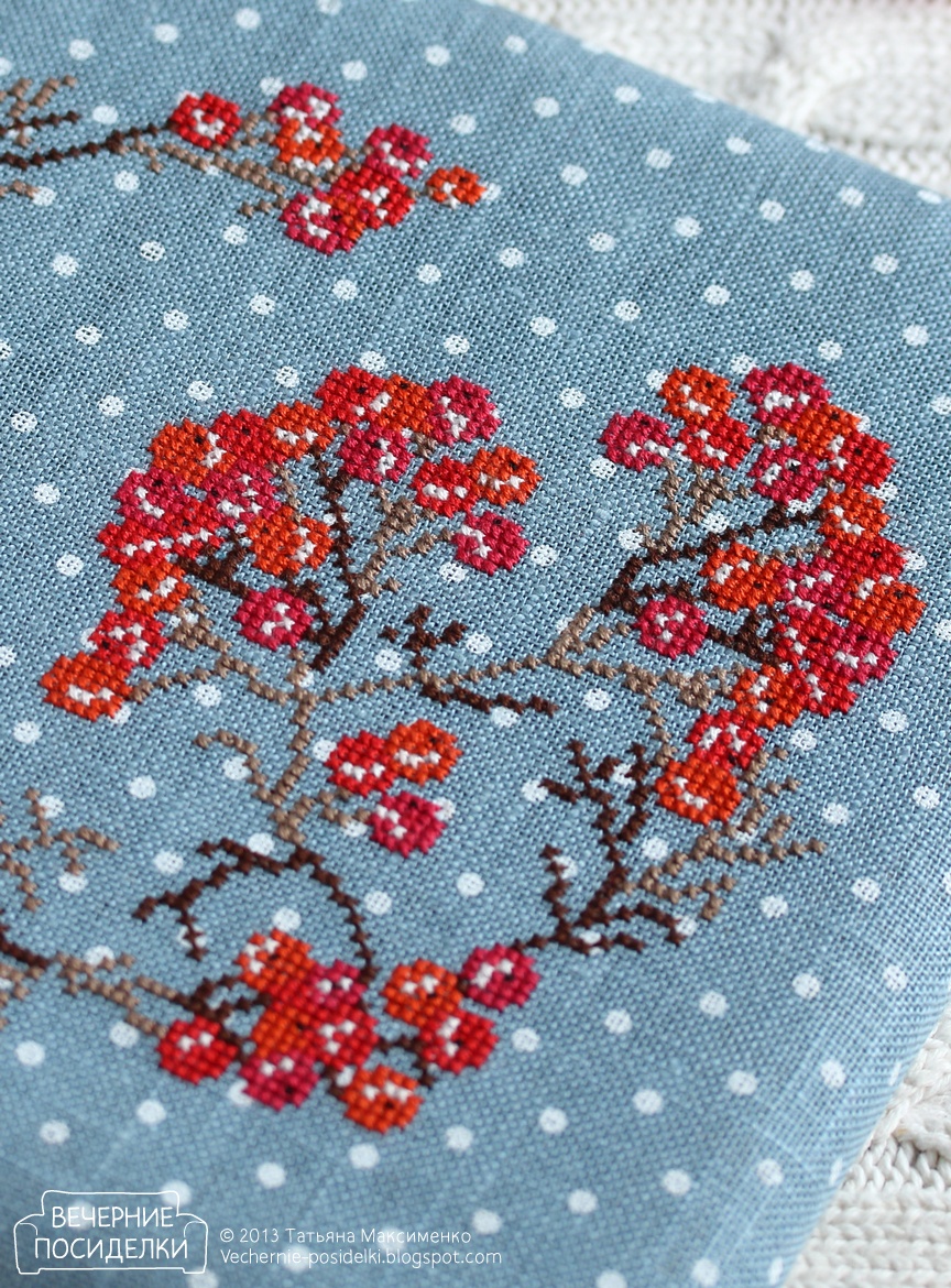 Веночек от Acufactum. Вокруг рябины полагалось вышить снежинки, но я решила, что горошкового «снега» вполне хватит. Вышивка натянута на подрамник, до весны отправляется на кухню.