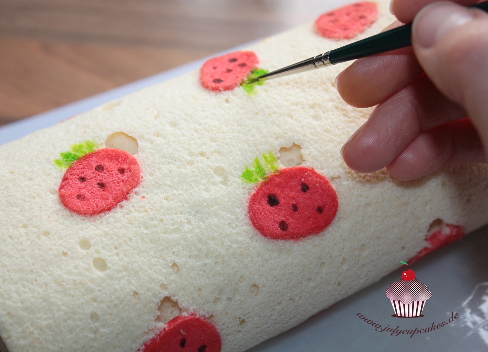 При помощи пищевой краски, дорисовываем зелень и точечки на клубнике.