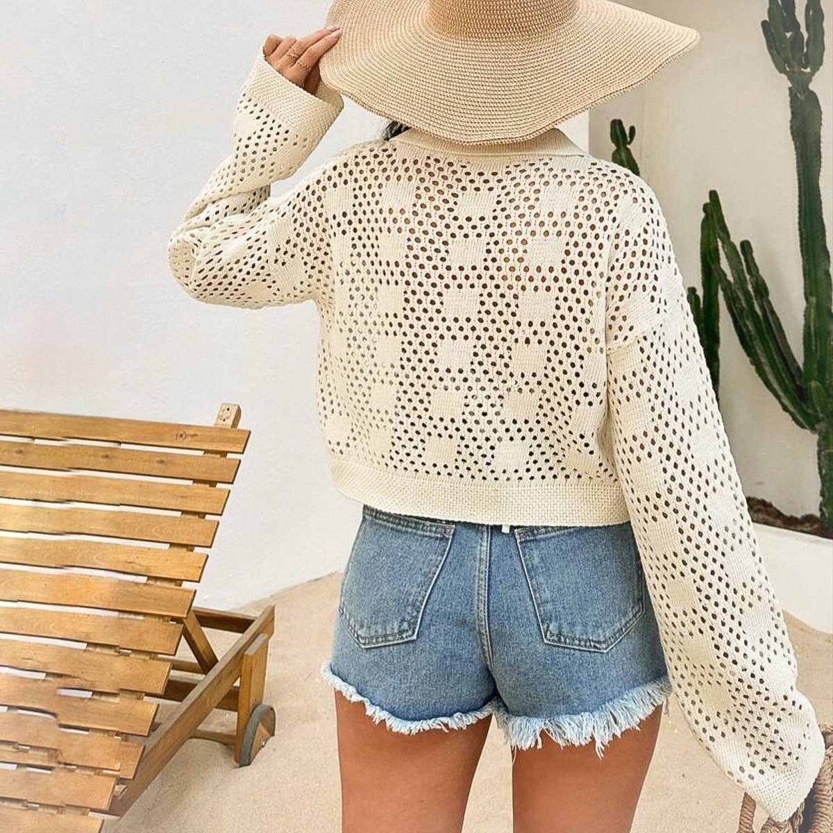 Джемпер имеет укороченную длину до талии. Отложной воротник в стиле классического поло добавляет нотку элегантности. Спереди вырез, оформленный планкой, и застёжка на пуговицы.