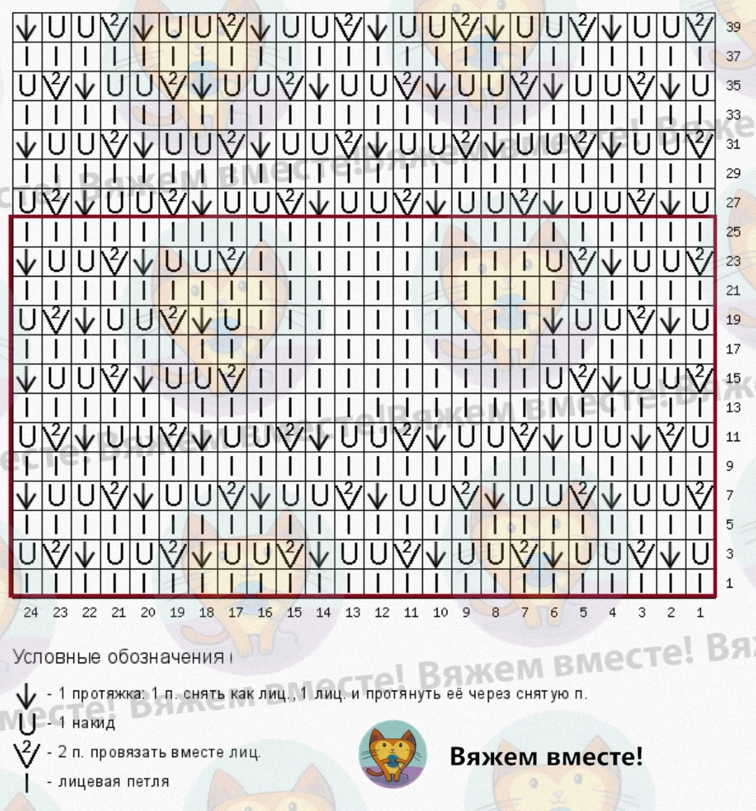 Раппорт узора равен 24 петлям по ширине полотна и 26 рядам по высоте.