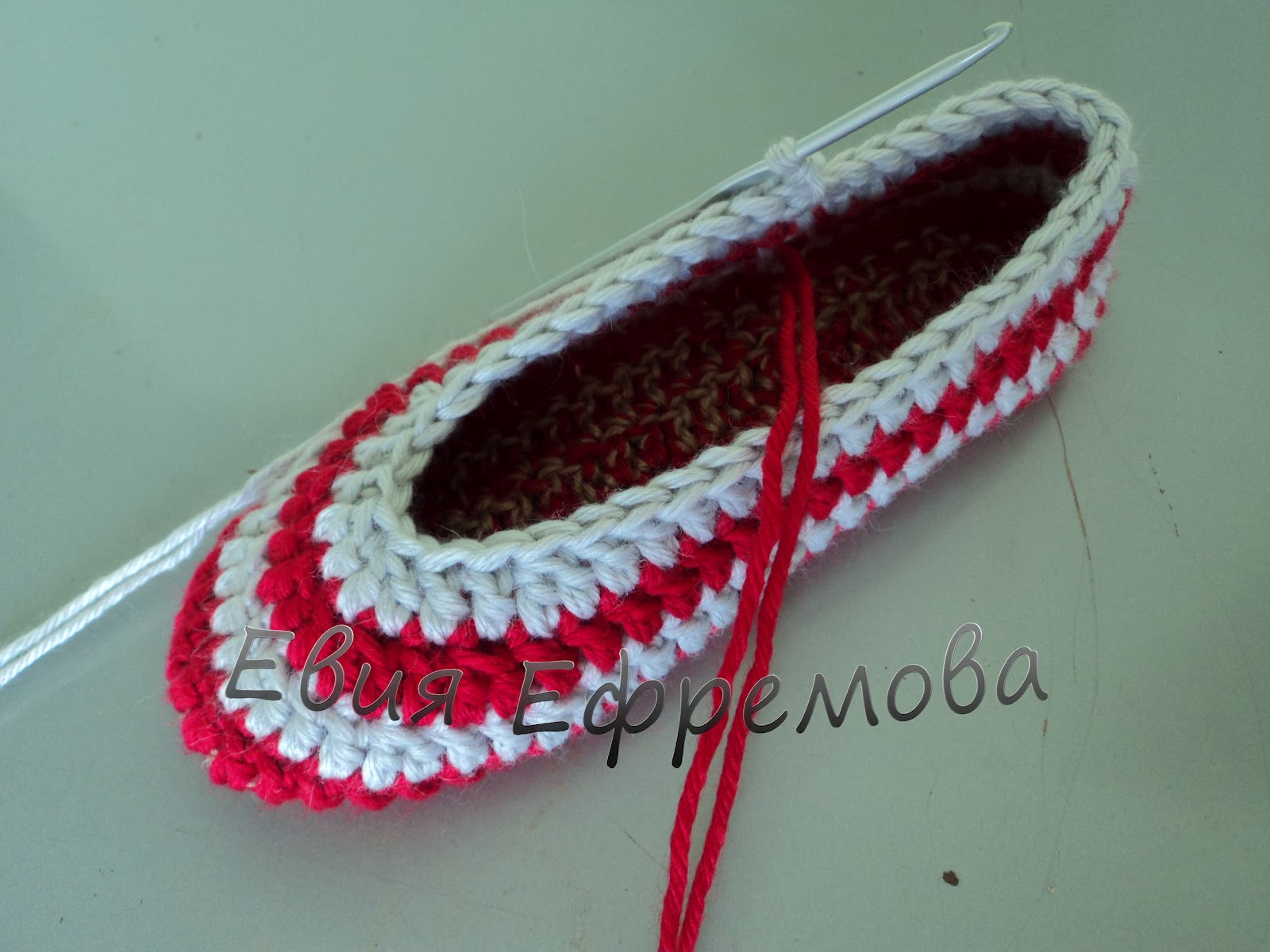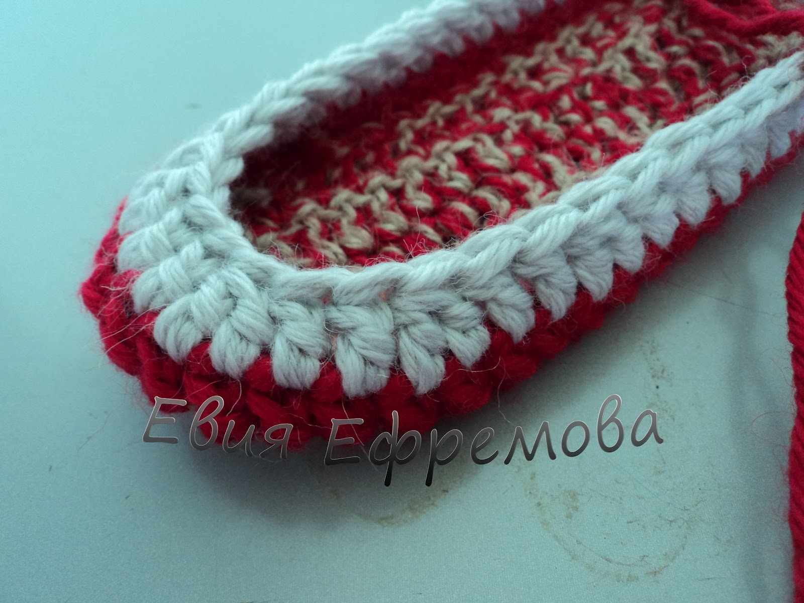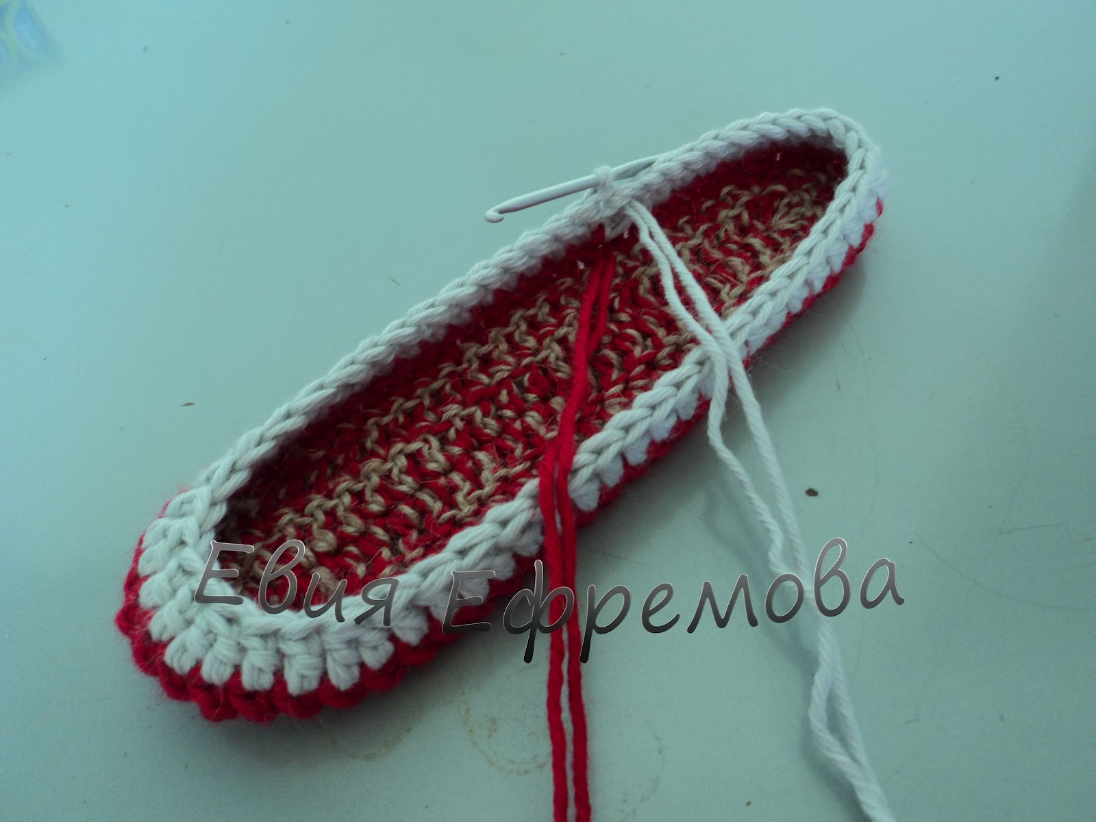Обвязываем красной нитью в 2 сложения столбиками без накида верх тапочка.