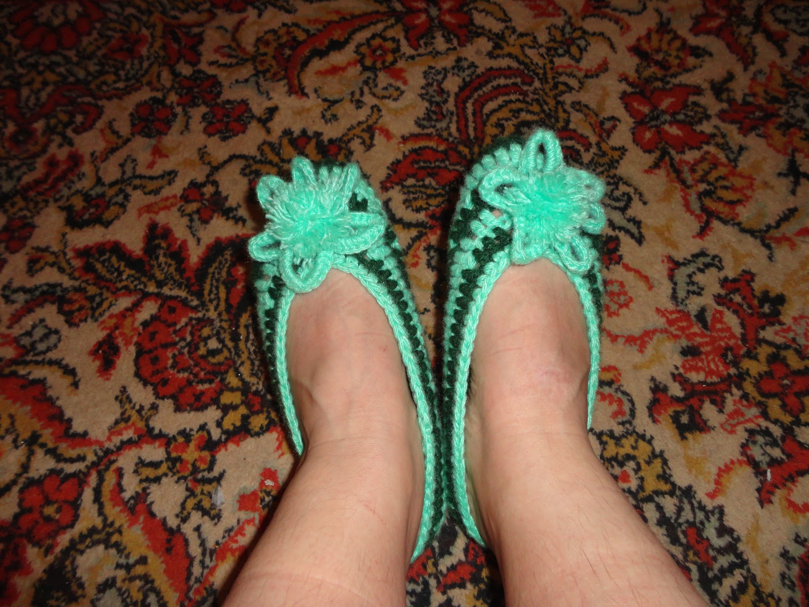 Убавляя на мысочке 3 петли и на пяточке одну. Отрезаем и заправляем нити. Тапочек готов!