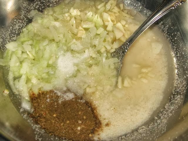 Добавить к манке вместе с солью и 2 чайными ложками приправы. Можно добавить и специи, но в этот раз ничего больше я не добавляла. Соли я положила 1-3 чайной ложки.