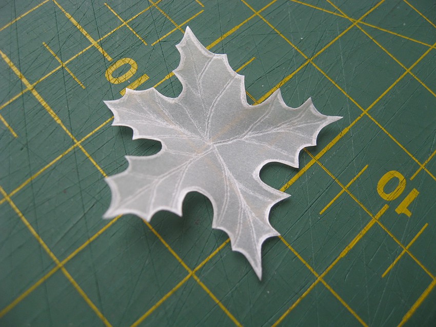 Потом кладу цветочек на кусок картона (т.е. на чуть более жесткую поверхность), перевернув цветочек лицом вниз (т.е. следы от иглы остаются на нижней стороне). И той же иглой рисую прожилки. Чем тверже рабочая поверность, тем бледнее и тоньше следы от иголки...