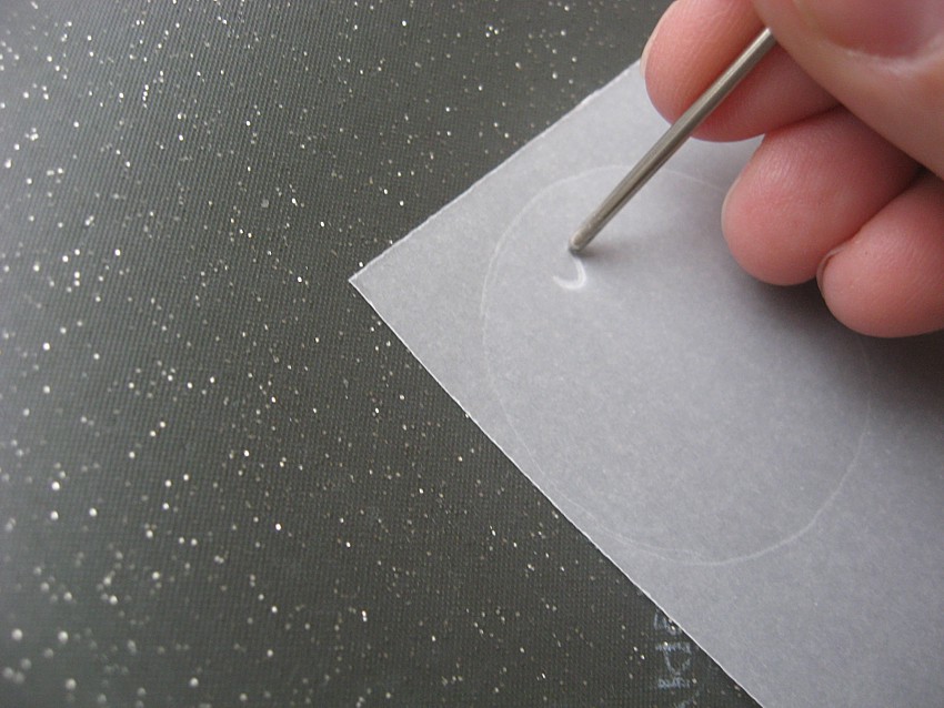 Я рисую их без трафарета (но можно сначала сделать трафарет)... Без трафарета они получаются натуралистично-кривоватые... ))) Сначала намечаю круг, а потом делю его на пять лепестков... Рисую гобеленовой иглой (№18, для вышивки, с тупым кончиком), положив кальку на коврик для мыши.