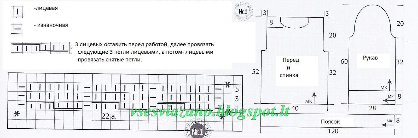 Пуловер состоит из 5 деталей: спинка, перед, 2 рукава и поясок-лента. (схема № 1, выкройка № 1).