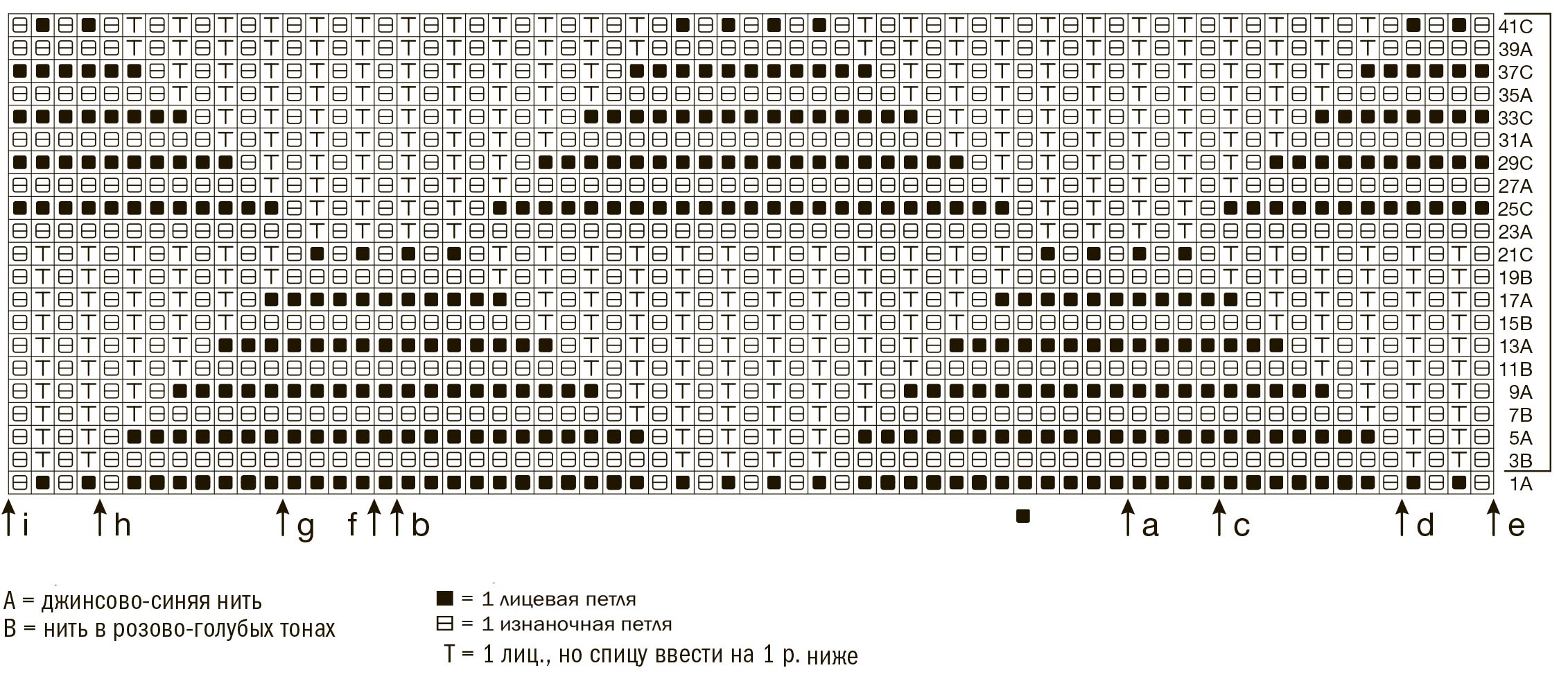 Далее вязать мозаичным узором, чередуя 2 р. джинсово-синей нитью и 2 р. нитью в розово-голубых тонах, в следующей последовательности: начать с кром. и 0 (4-12-16) п. от стрелки а (c-d-e) до стрелки а, 3 раза повторить раппорт из 32 п. между стрелками а и b, закончить 1 (5-13-17) п. от стрелки b до стрелки f (g-h-i) и кром.