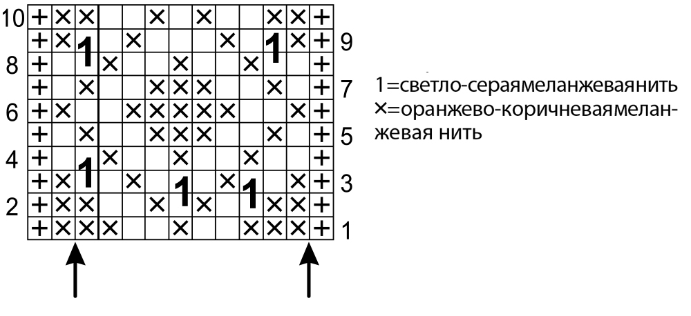 В 3-м и 4-м р. на темно-серых участках лицевой глади всех деталей вышить оранжево-коричневой меланжевой нитью 1 ряд крестиком (каждый крестик = 2 п. и 2 р.) с интервалом 2 п. В 7-м и 8-м р. на темно-серых участках лицевой глади всех деталей вышить натурально-белой нитью 1 ряд крестиком (каждый крестик = 2 п. и 2 р.) с интервалом 2 п.; этот ряд выполнить со смещением в отношении 1-го ряда уже вышитых крестиков.