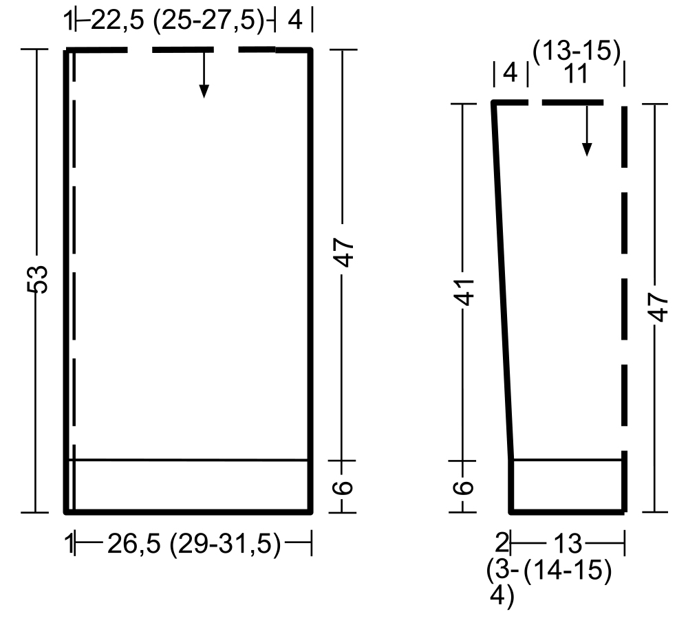 Далее продолжить вязать спинку и дополнительно набрать с обеих сторон по 7 п. = 93 (103-113) п.