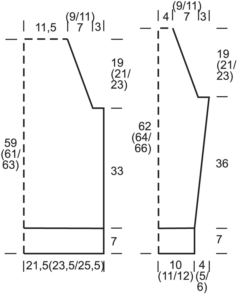 Одновременно на общей высоте 40 см = через 56 р. от планки закрыть с обеих сторон для регланных скосов 1 x 3 п., затем в каждом 4-м р. убавить с обеих сторон 7 x 1 п. и в каждом 2-м р. 1 (3/5) x 1 п., выполняя при этом подчеркнутые убавки = 28 п.