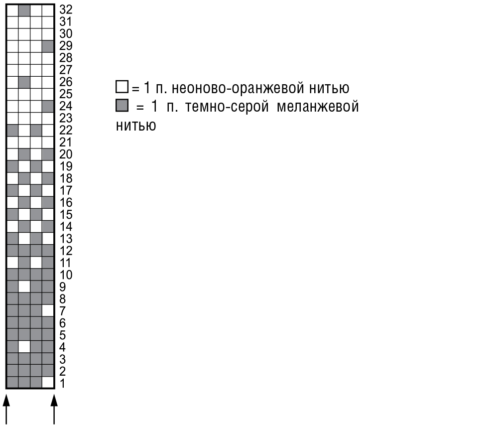 Пряжа Lana Grossa «Mille II» (50% овечьей шерсти, 50% полиакрила; 55 м/50 г) — по 300 (350/400) г темно-серой меланжевой (№16) и неоново-оранжевой (№503); спицы №6 и 7; круговые спицы №6 длиной 40 см.