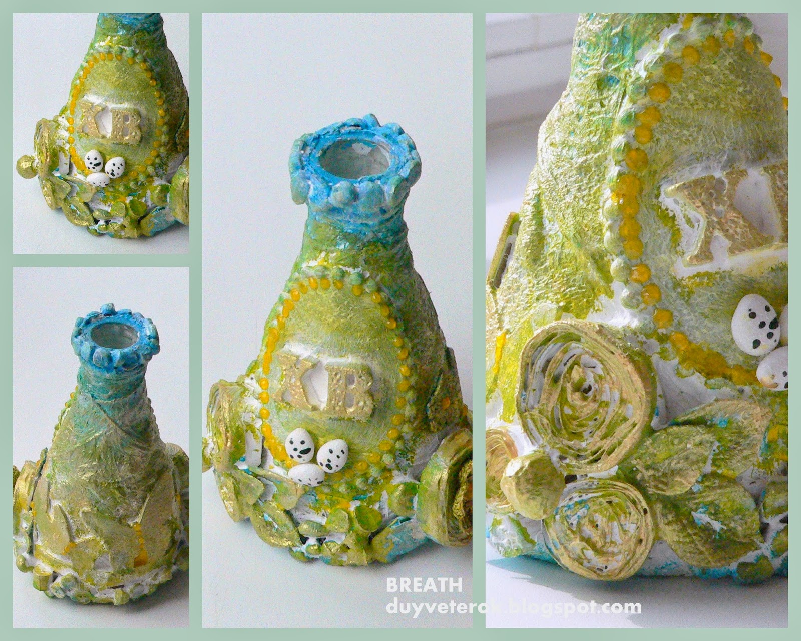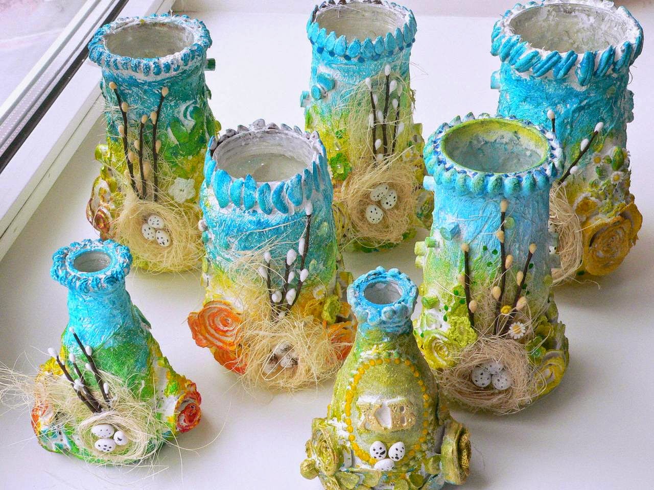 4. Добавили гнездышки с яичками и веточки вербы, мелкие цветочки вязаные и из пластики, капельки контуром Viva.