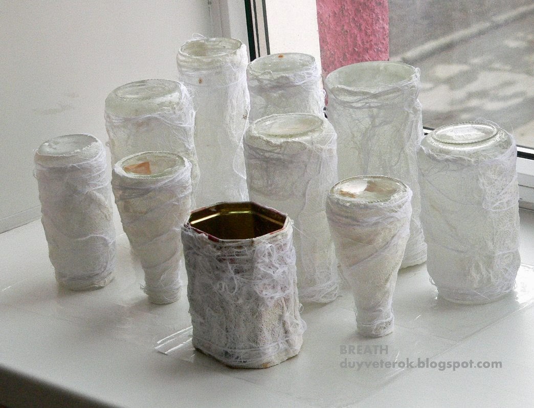 1. Банки задрапировали марлей и пряжей (белая "травка"), клеили на ПВА