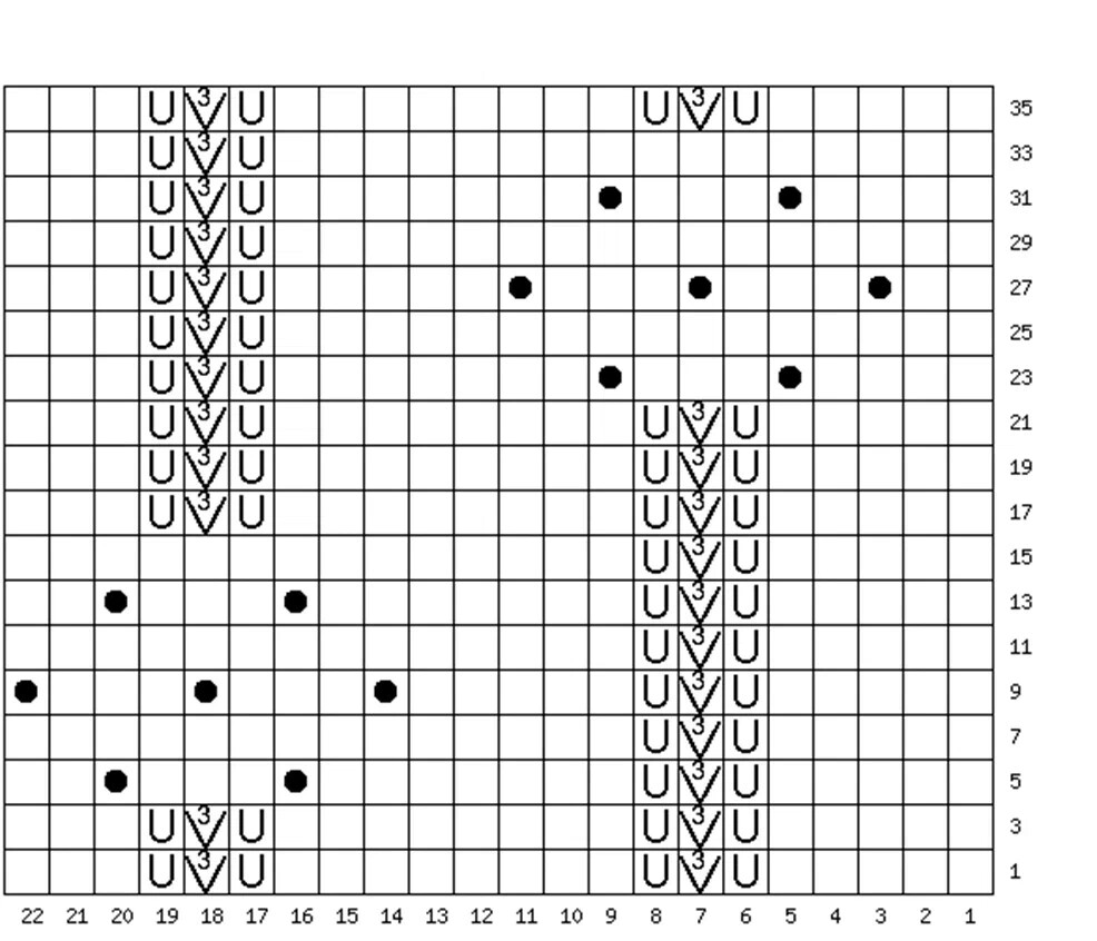 Шишечка (черный кружок) - 1 петлю вяжу из протяжки, 3 петли ( лицевая/накид /лицевая) и с самой петли, затем 1 петлю из протяжки. Всего 5 петелек - это первый ряд. 2 р - 1 кромочная, 4 изнаночных. 3 ряд - 1 кромочная, 4 лицевых. 4 ряд - 1 кромочная, 4 изнаночных. В 5 ряду 3 петли снимаем, следующие 2 провязываем вместе и накидываем поочереди снятые петли. Пока не останется 1 петелька. С изнаночной стороны вяжем шишечку изнаночной петлей.