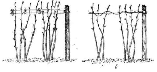 Подвязка у крупноплодной малины побегов к шпалере (вместо 2 кг увеличивает урожайность до 4 - 8 кг)