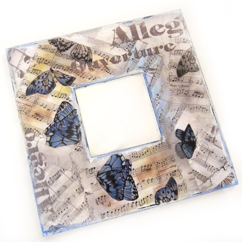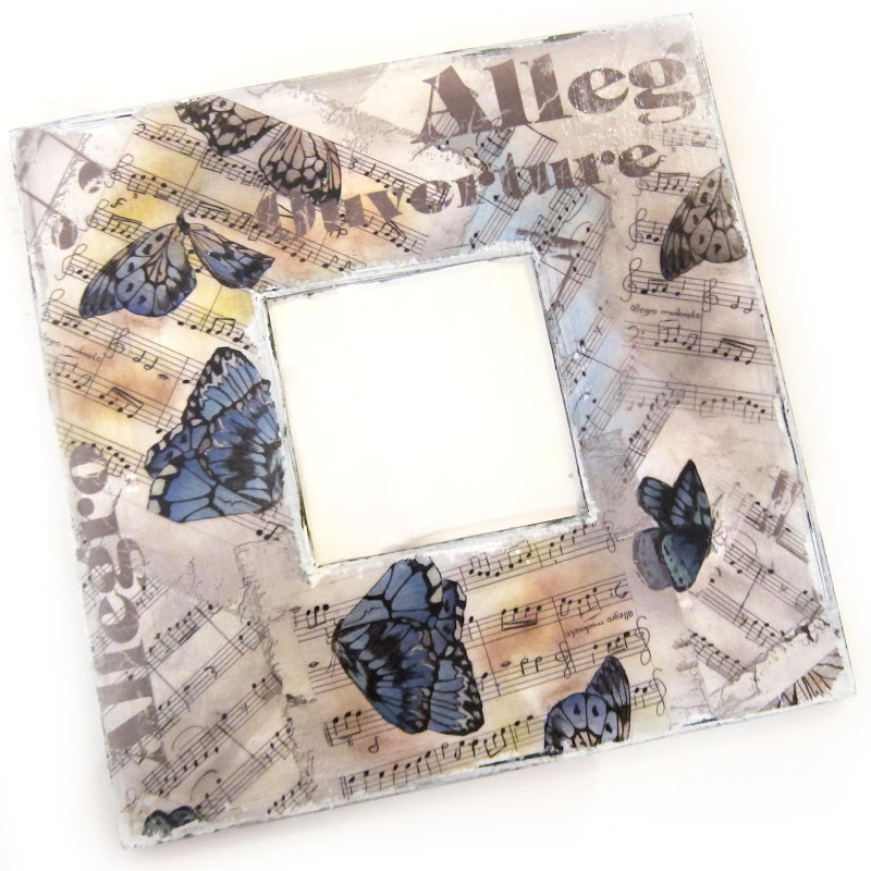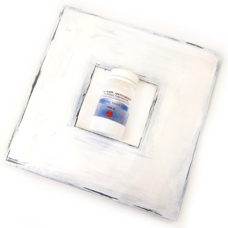 Вырезаем декупажную карту по форме рамы. Приклеиваем ее: аккуратно прикладываем декупажную карту к заготовке (я предварительно вымачиваю карту в теплой воде несколько минут) и покрываем сверху слоем декупажного лака.