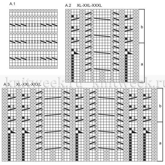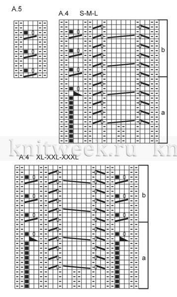 Через 23 см от наборного края в след. лиц.р. продолжить: 5 п. платочным узором, 2 лиц.п., A.2 a, 47-55-63-65-79-91 лиц.п., A.3 a, 47-55-63-65-79-91 лиц.п., A.4 a, 2 лиц.п., 5 п. платочным узором. Поставить 2 маркера, отсчитав от краев по 51-55-59-64-71-77 п. После того, как верт. раппорты по схемам будут выполнены, продолжить вязание по схемам A.2 b, A.3 b и A.4 b на тех же петлях. Через 29 см от наборного края прибавить по 1 п. с каждой стороны от маркеров, повторить ряд прибавлений каждые 3-3-4-4-4-5 см еще 3 раза = 211-227-243-267-295-319 п.
