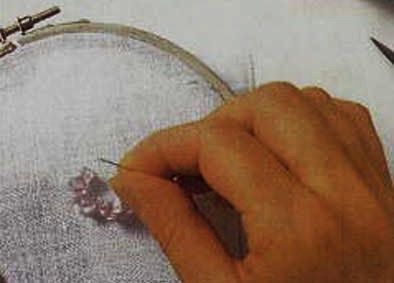 2. Маленькими стежками прикрепите розочки к ткани. Заканчивая работу, вышейте центр цветка швом "узелки".