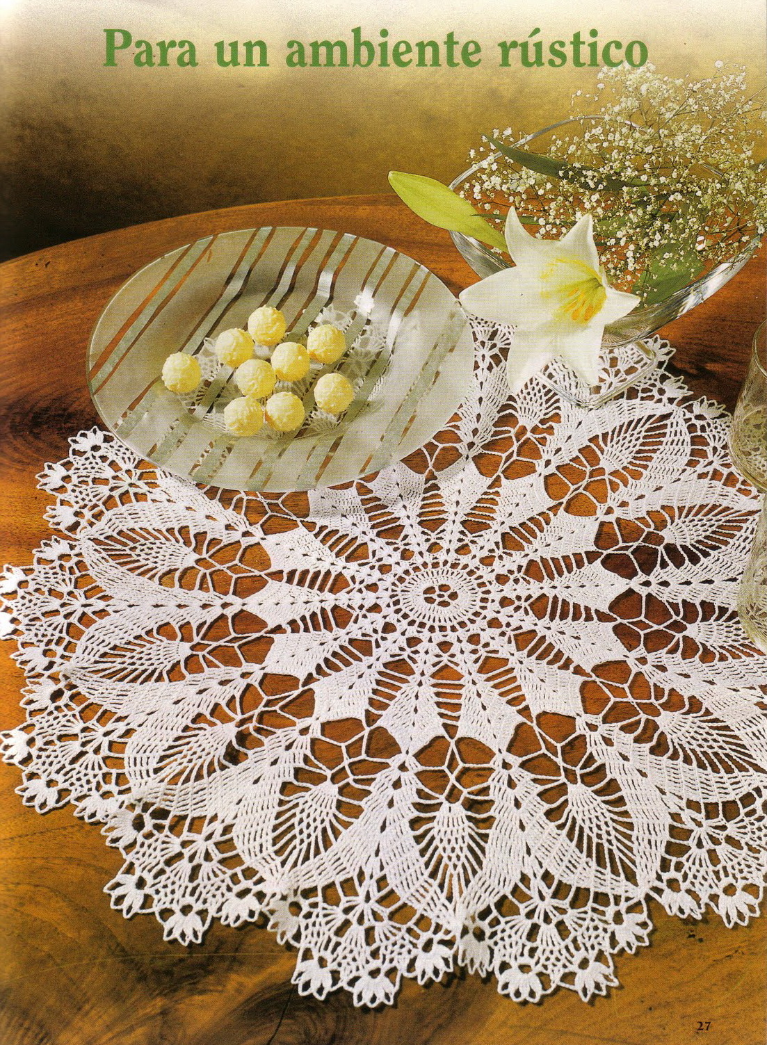 [показать]Очень ажурная салфетка из тонких вытянутых ананасов и воздушных арок.